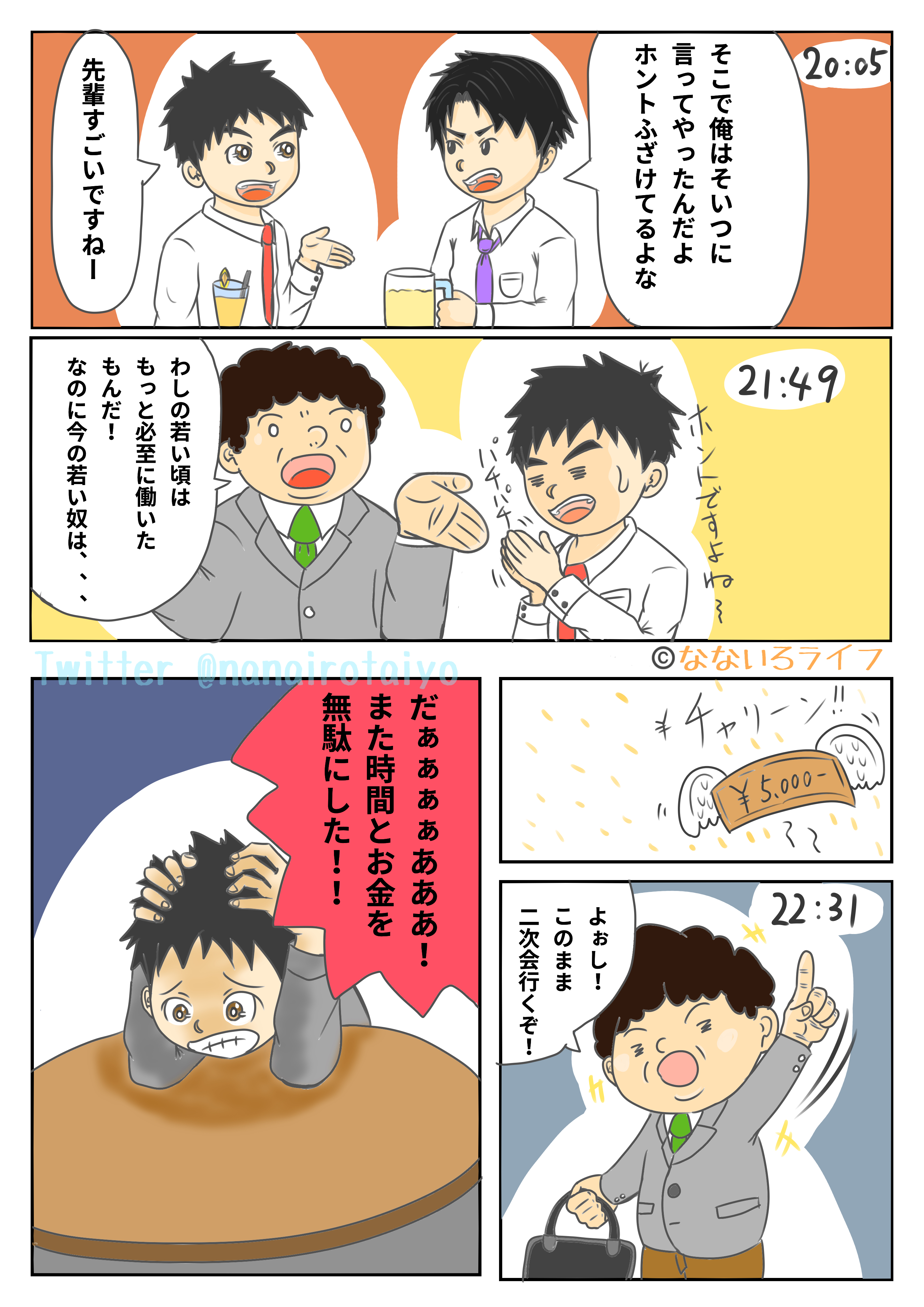 「飲みニケーション」等という程のいい造語でそれっぽく終業後の飲み会を正当化しようとしているようですが、単なる「浪費」に付き合わされるだけです。