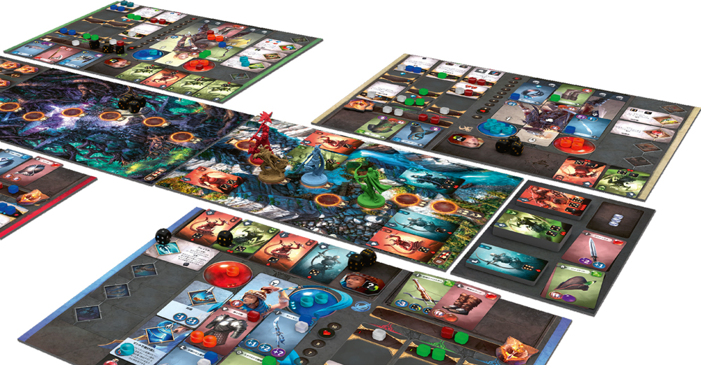 4隅の大きなボードがプレイヤーボード、中央の縦長ボードがダンジョンボード、その上に装備カード・デーモンカード、ジェムなどの様々なコンポーネントがはいちされています。