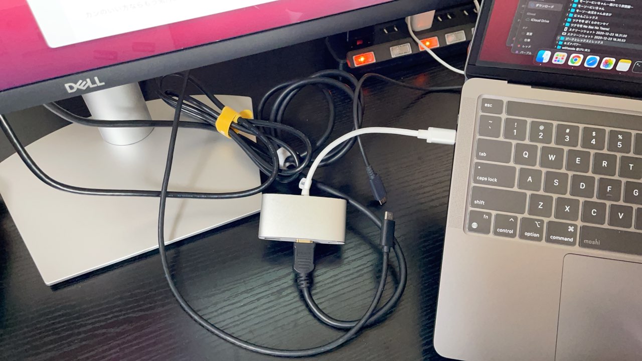 MacBook Proに繋げているこちらのケーブルを使用して、HDMI(外部出力)・USB ーC(充電)を一本化。