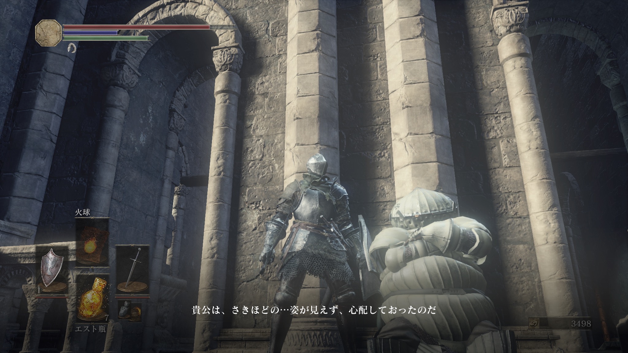 本作では無印にも登場したカタリナ騎士(今作ではジークバルド)にも会えます。いつもながら可愛らしい玉ねぎ装備に身を包み、主人公の行く先で唸っては一歩ずつ先へ進む姿が好印象。