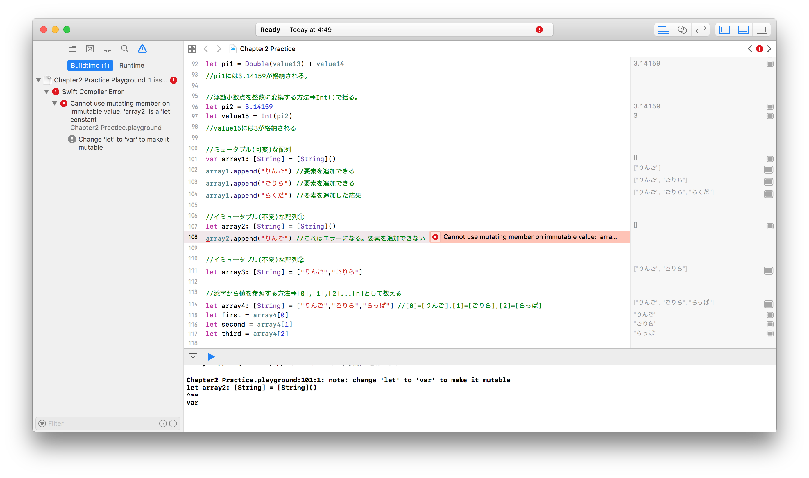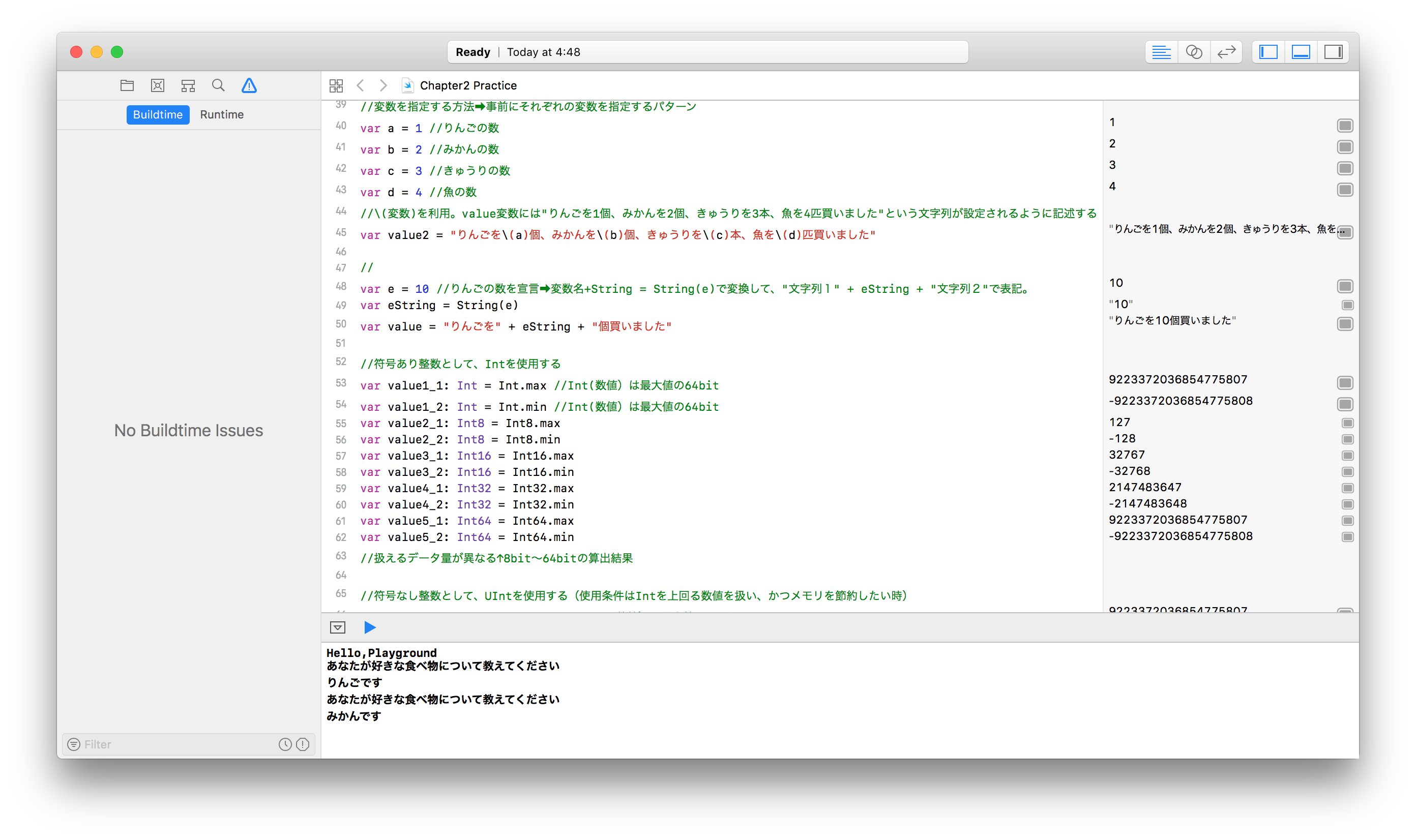 きちんと本に聞かれている通り、コードを打ち込むとビルド結果が右サイドバーに反映されるので心地よく練習ができます。