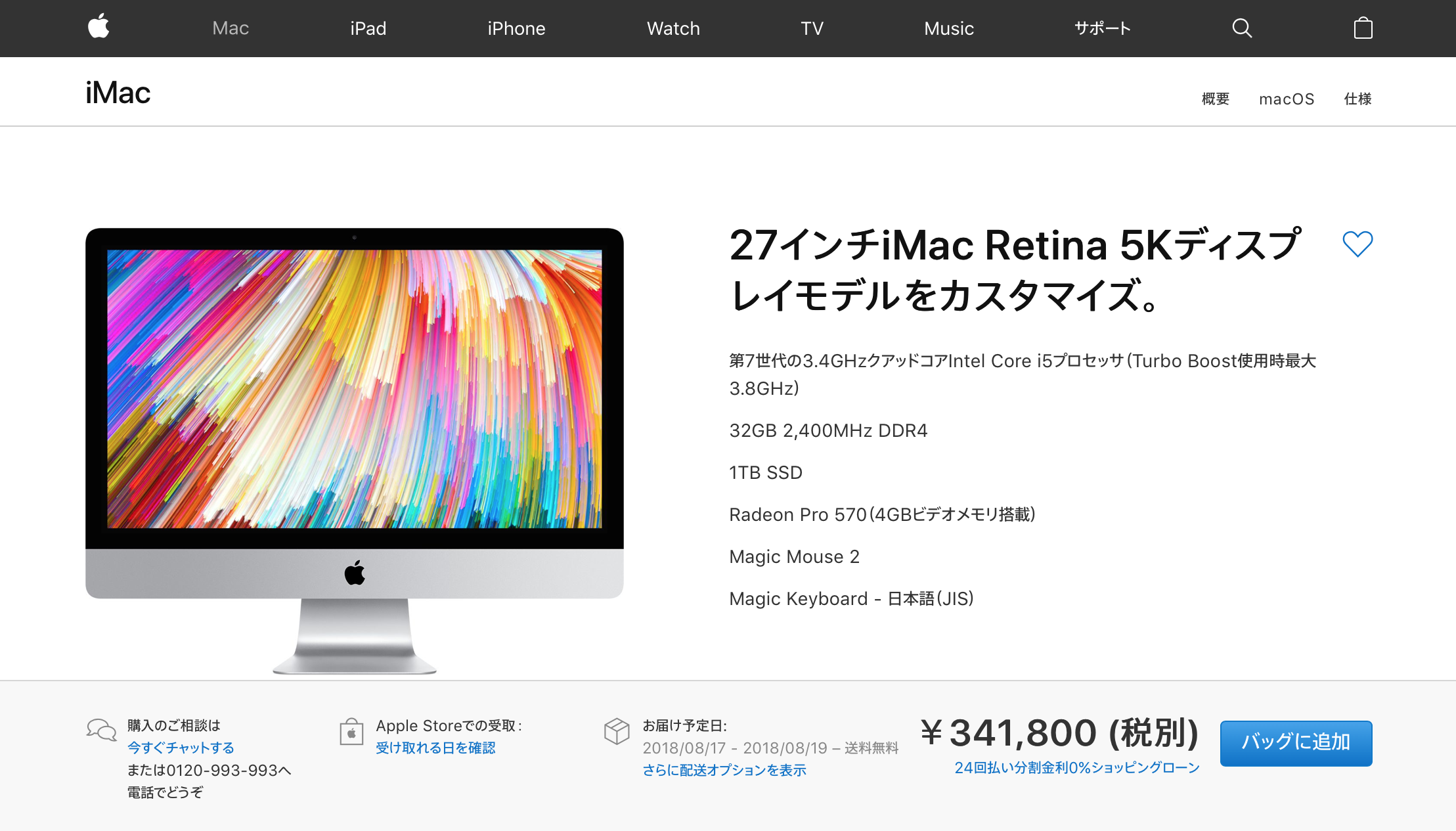 フルスペックで見積もった場合、27インチのメモリ32GBの1TB SSDのiMacでお値段、、、341,800円(税別)。