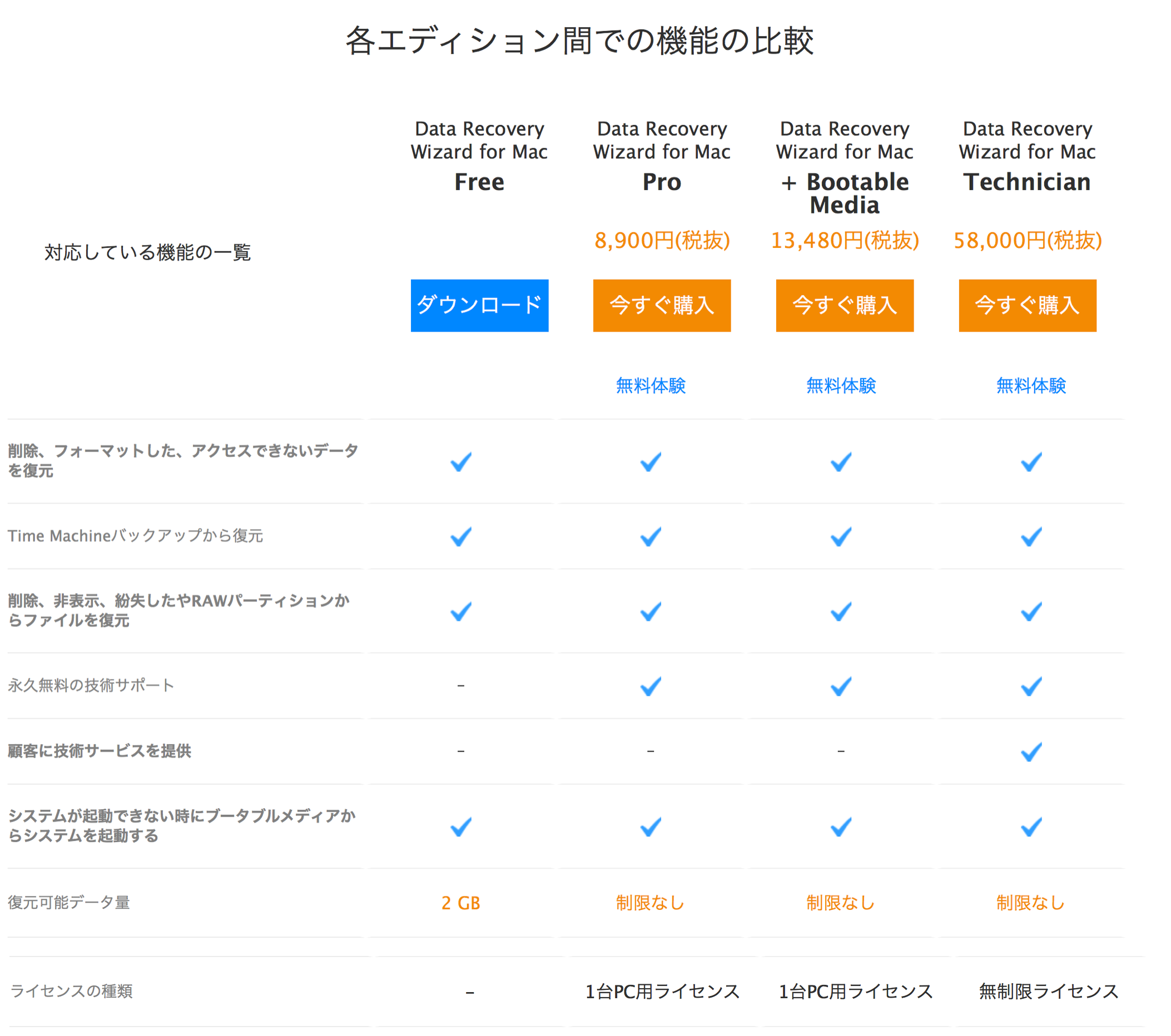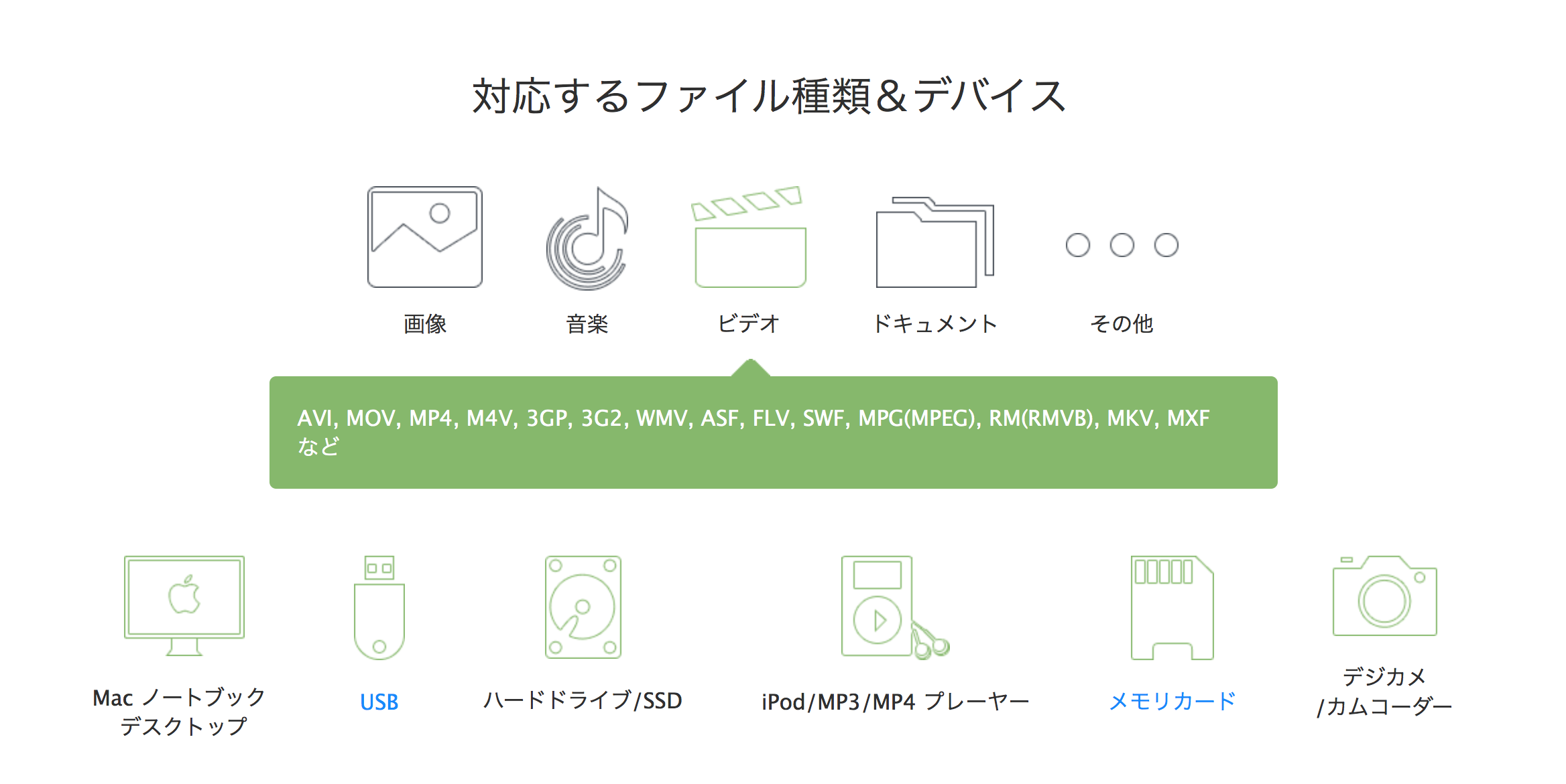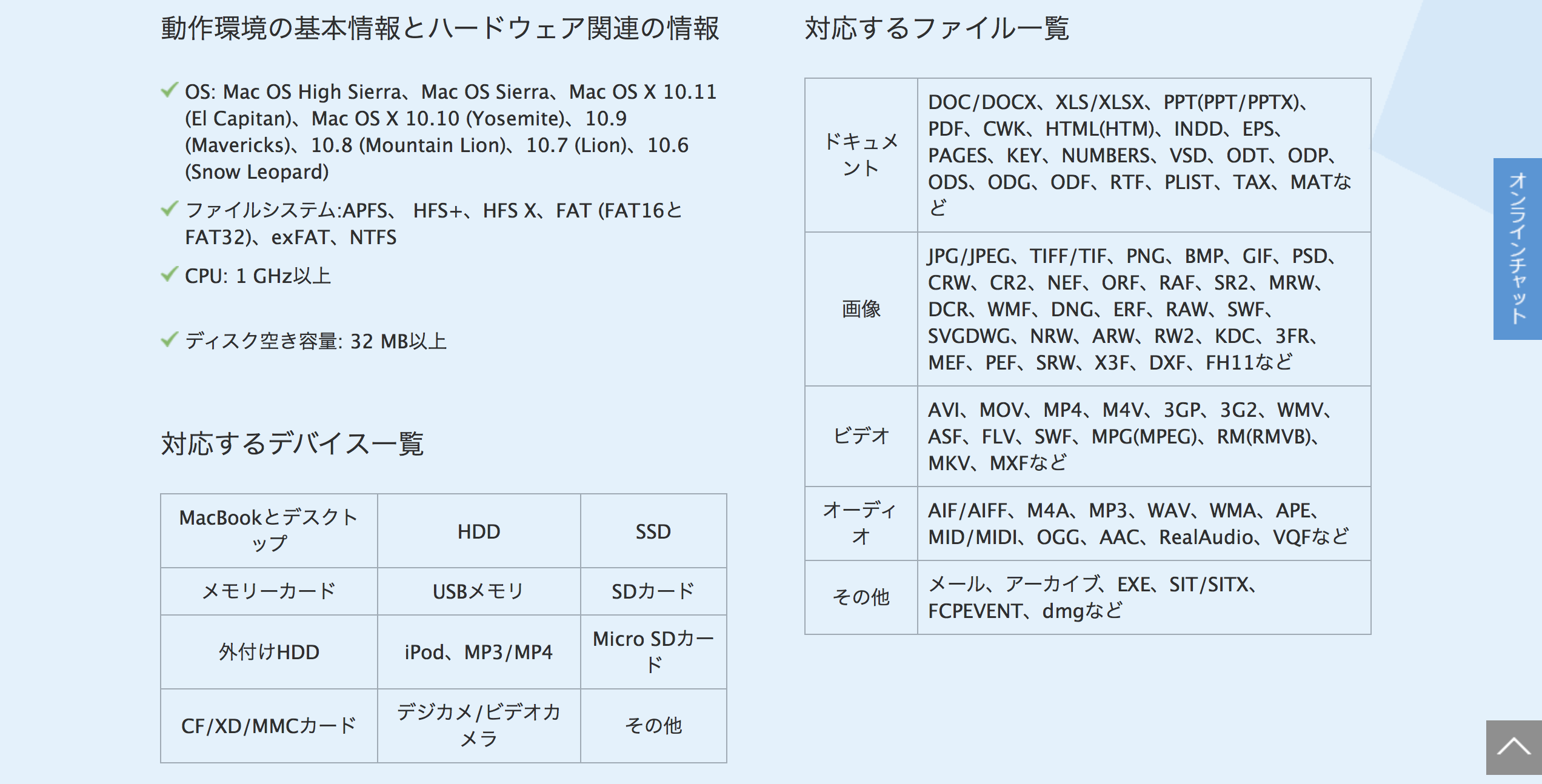 いわゆるドキュメント・画像・ビデオ・音楽等が復旧対象のファイル種類で、対応デバイスはHDD・SSDいずれも可能なため、Mac本体・SDカードやUSBメモリ・外付けHDDといったものもデータ復旧が可能なようです。