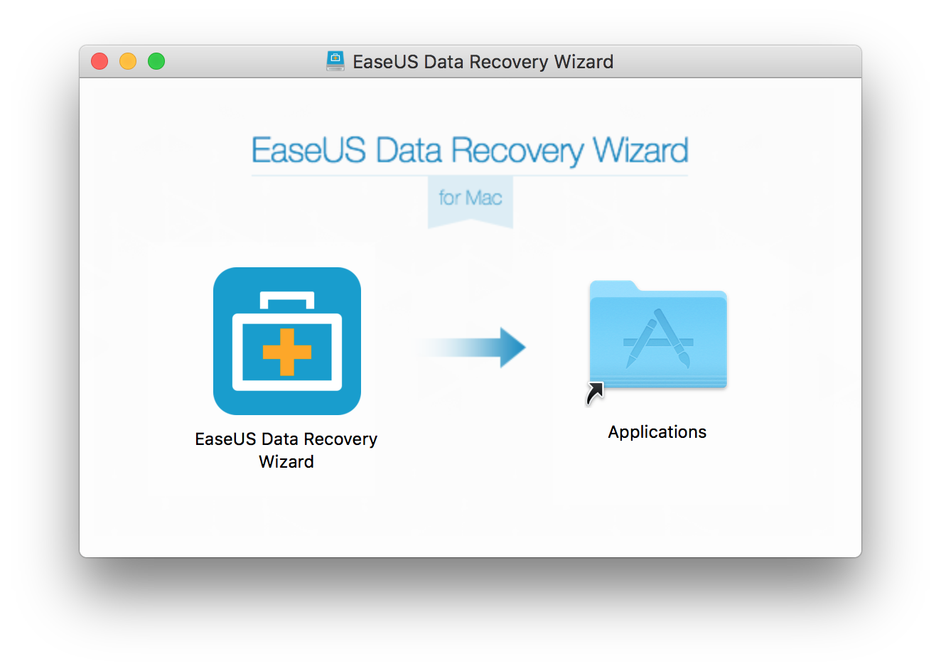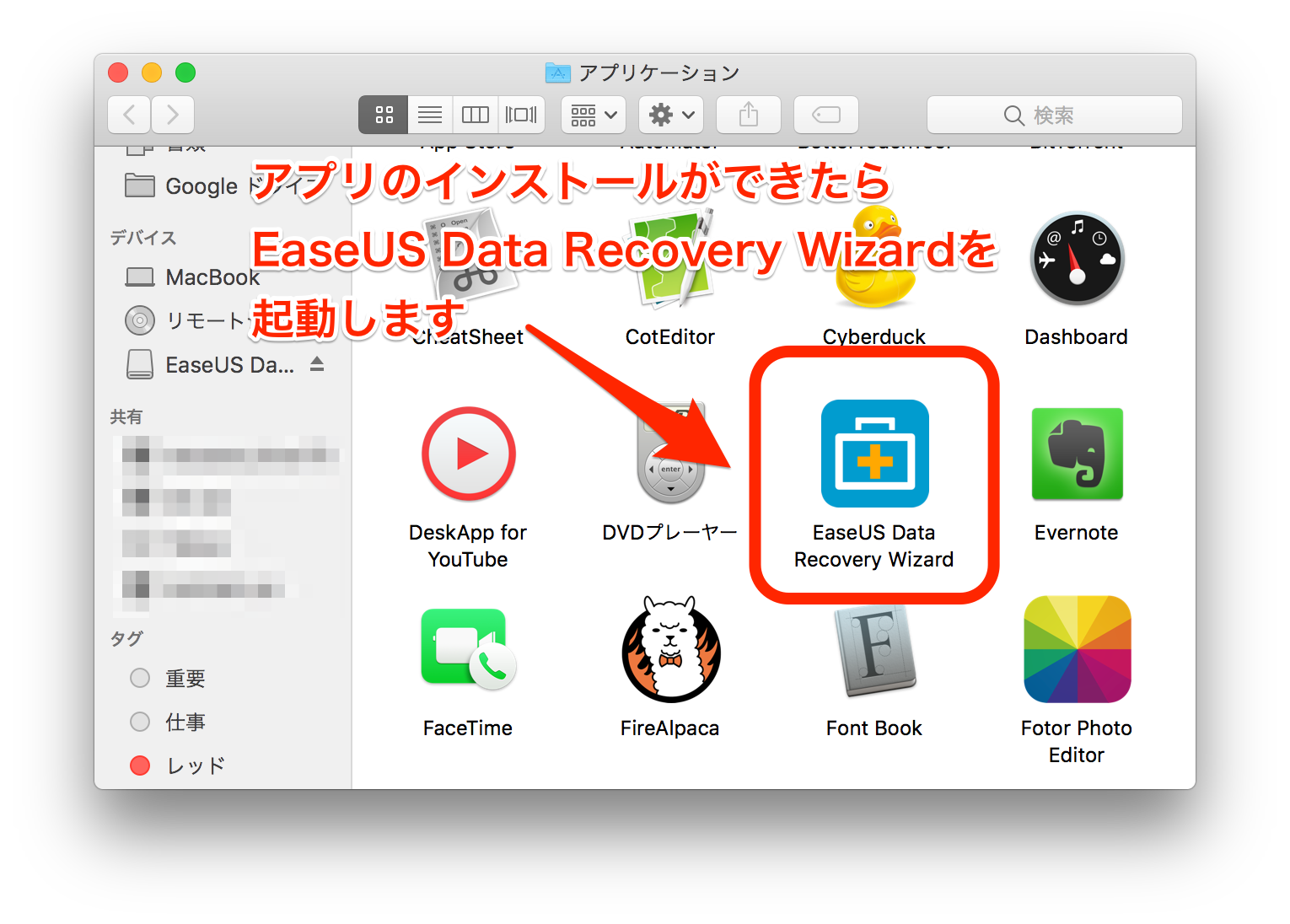 その後、左側表示されるアプリアイコンを右のアプリケーションフォルダへドラッグ&ドロップするとアプリがアプリケーションフォルダへ保存されますので、LaunchpadかアプリケーションフォルダからEaseUS Data Recovery Wizardを立ち上げます。