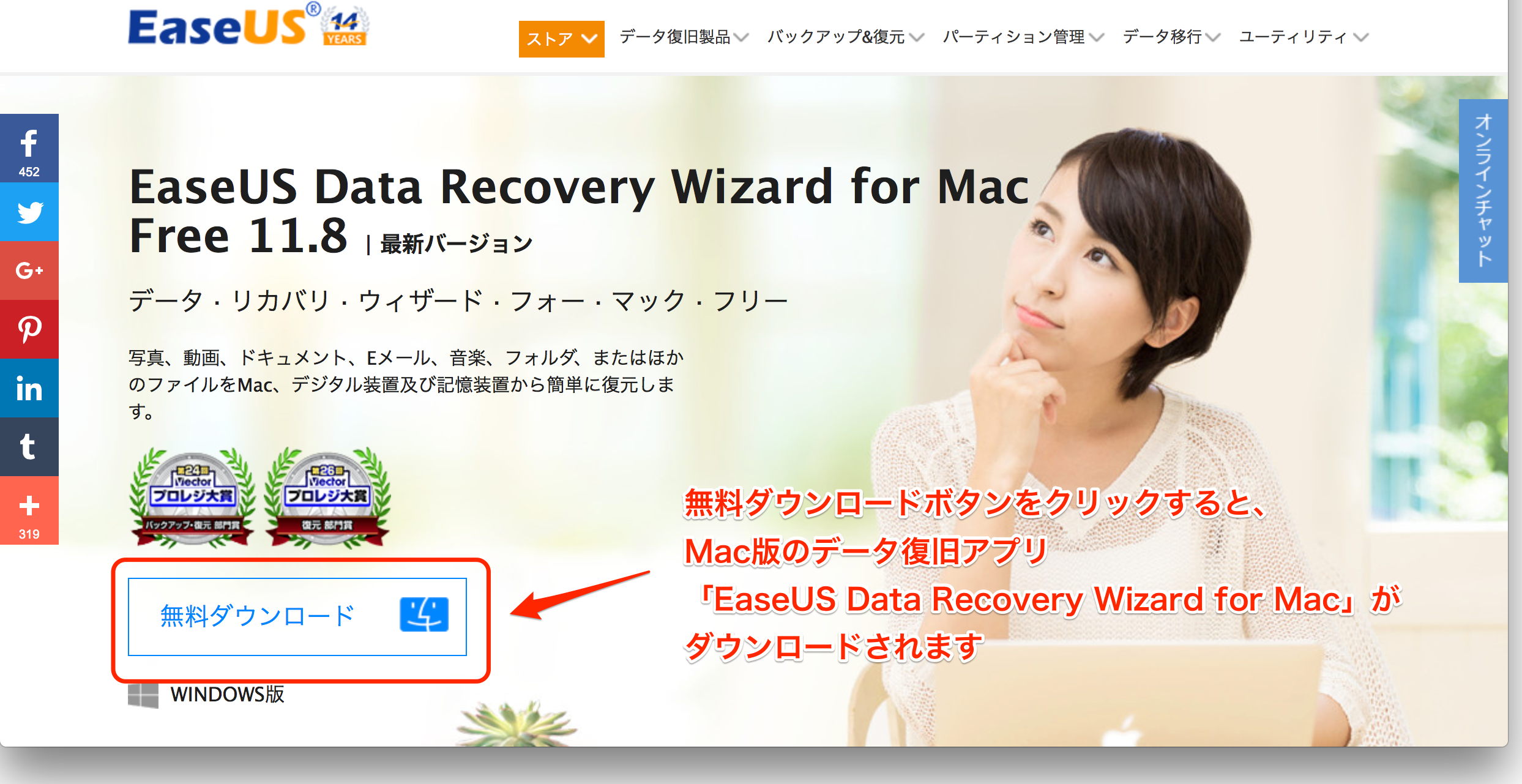 EaseUS公式サイトより「EaseUS Data Recovery Wizard for Mac」の無料ダウンロードをクリックします。