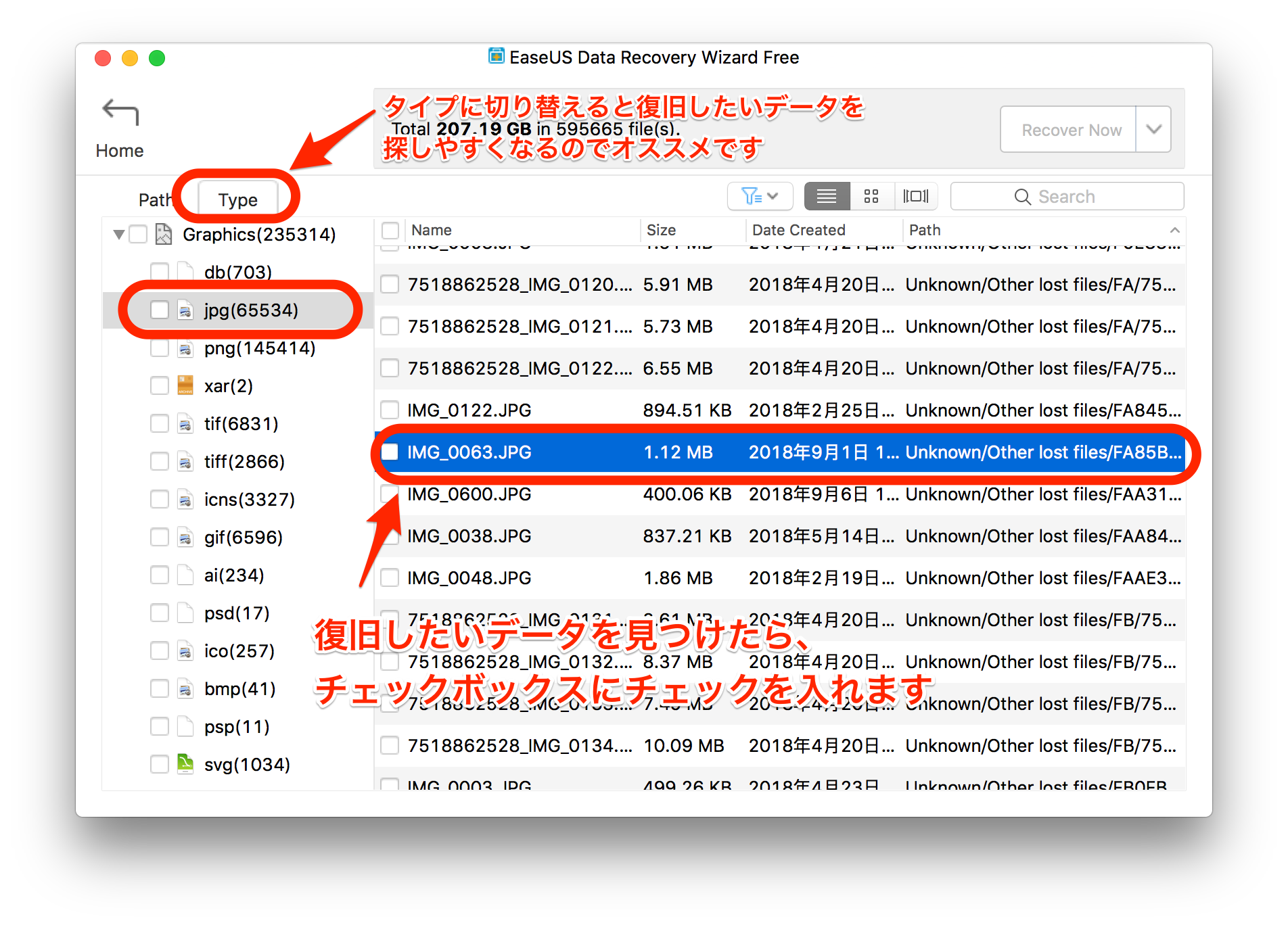 このアプリの便利な機能として、左側のタブを「Type」に切り替えることで、ファイルの拡張子別にスキャン結果がまとめて表示されるというものがあります。