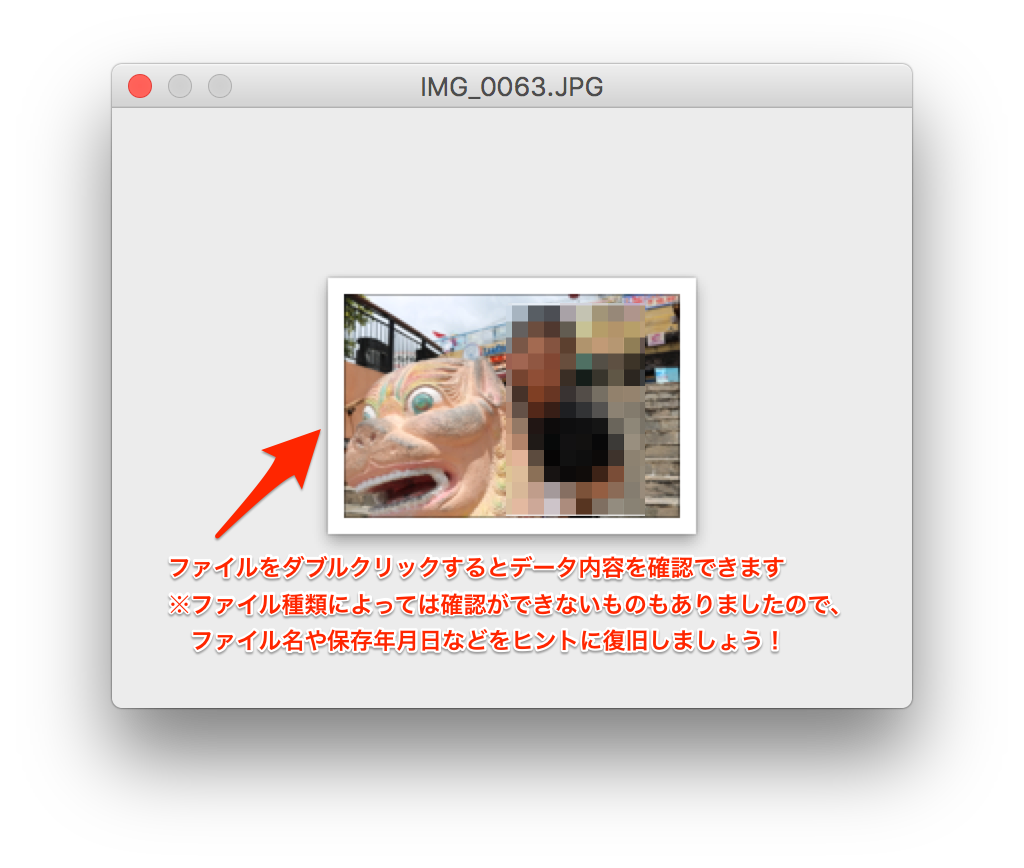 ファイル名をダブルクリックすることで、そのデータの中身が何か確認することができますので、復元対象のファイルと思われるものを見つけたらダブルクリックしてみましょう。