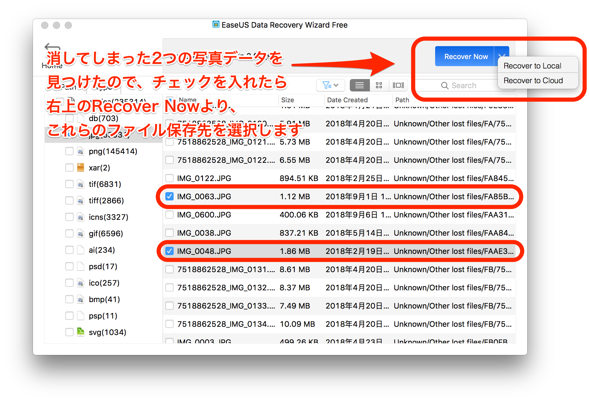 今回のように、写真データの復元をしたい場合、jpgやjpeg(またはPNG)といった拡張子から探し出すことができるので、とても助かりました。
