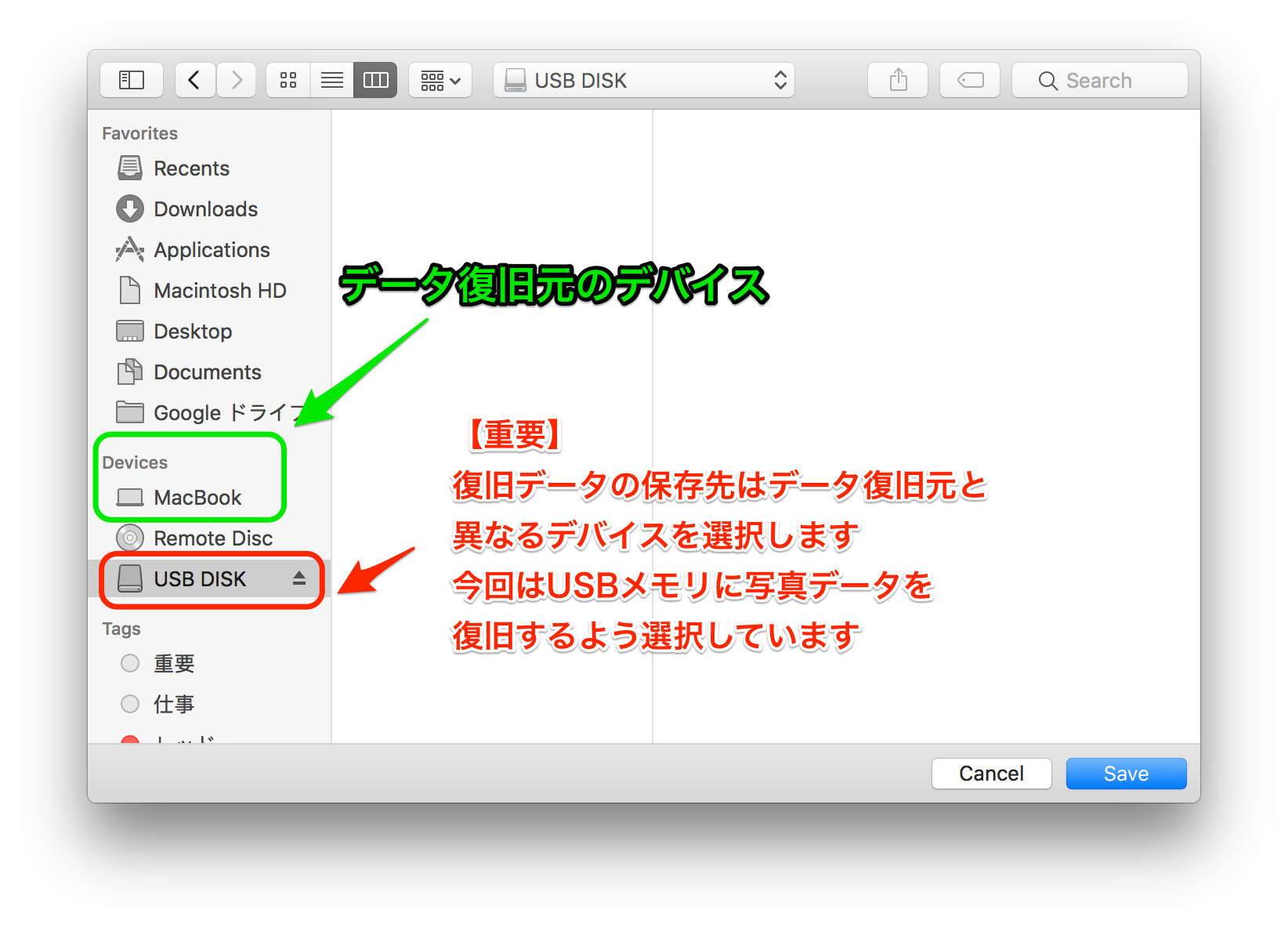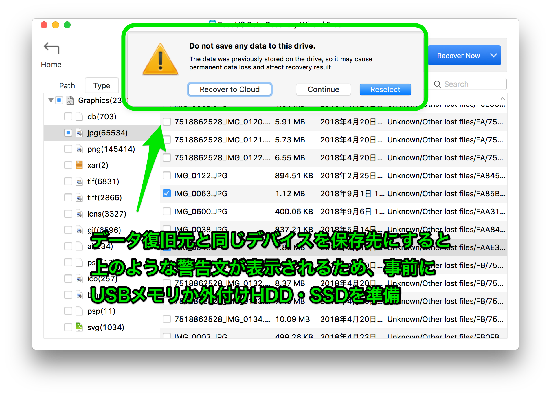 データの保存先は復旧元デバイスと異なる場所を選択しないと、データファイルは保存されません。