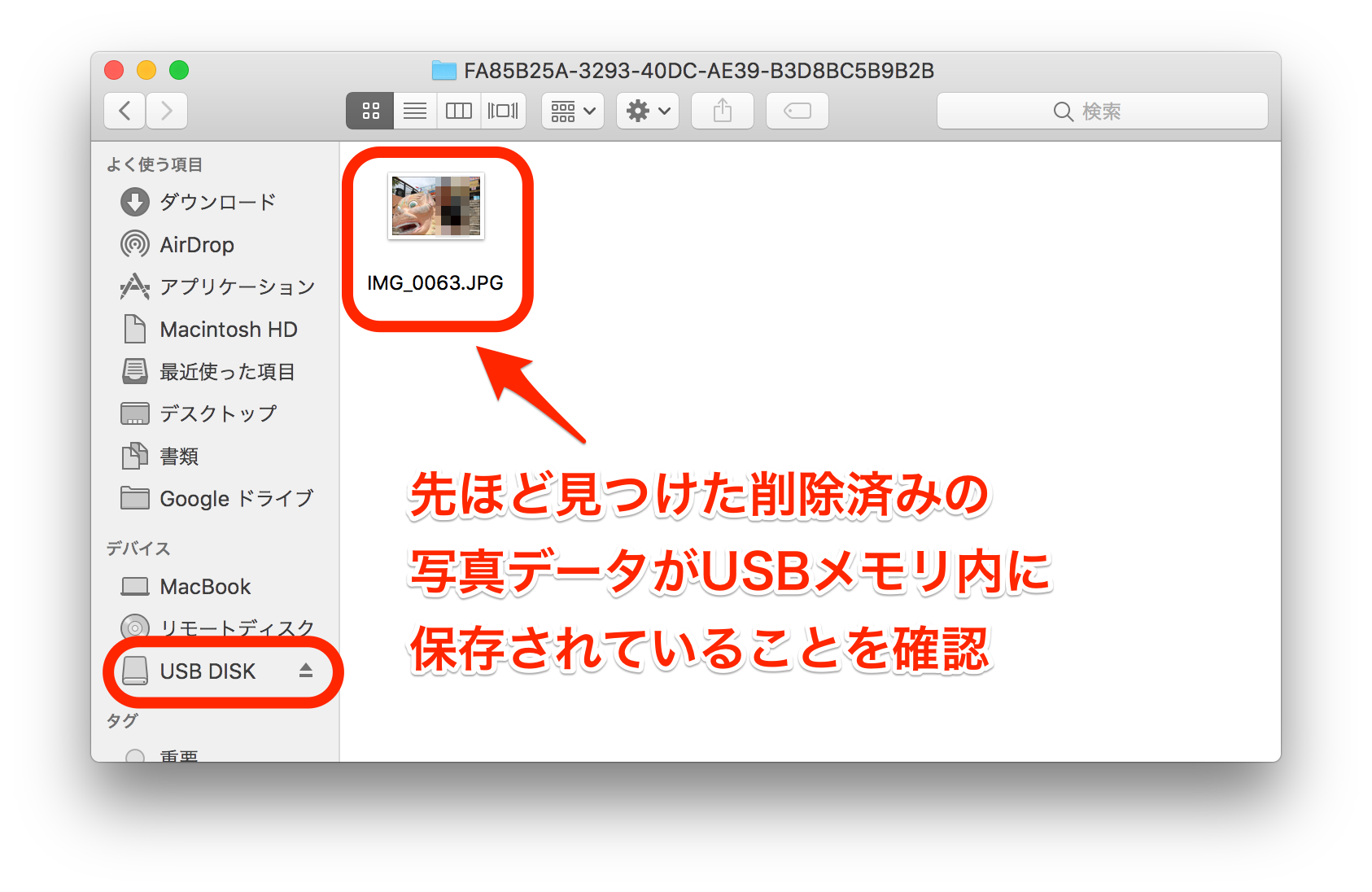 そのため、今回は復元したい写真データをUSBメモリに保存するようにしました。