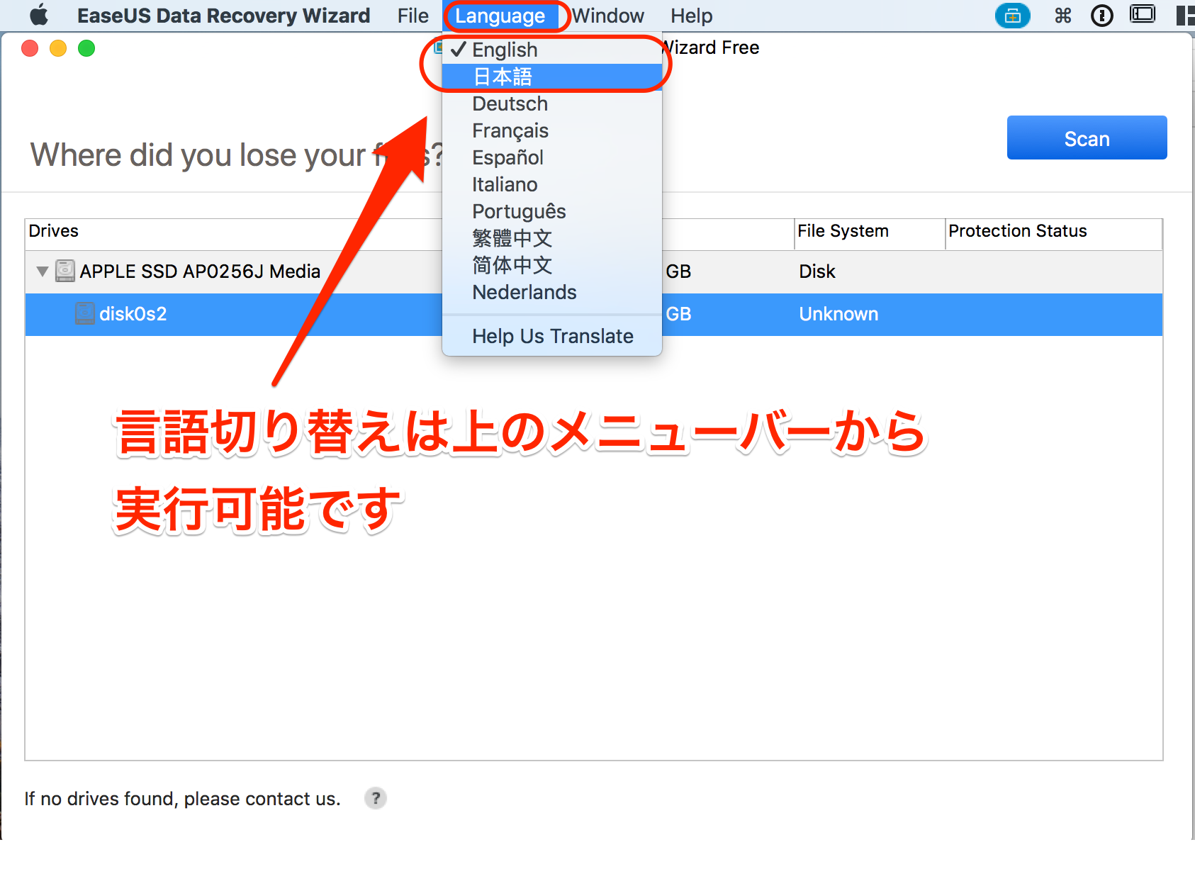 アプリ立ち上げ後、メニューバー>Languagesへ進み、日本語を選択すると再起動後に言語が切り替わります。