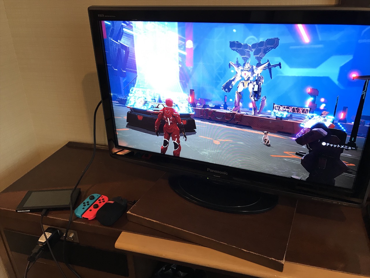 現在空き時間にプレイ中のゲーム、デモンエクスマキナのプレイ映像がホテルのテレビに出力できることを確認しました。出先でも最小限の構成で大画面ゲームプレイができる便利アイテムを手に入れたことで、ニンテンドースイッチライフがより強固になった気がします。