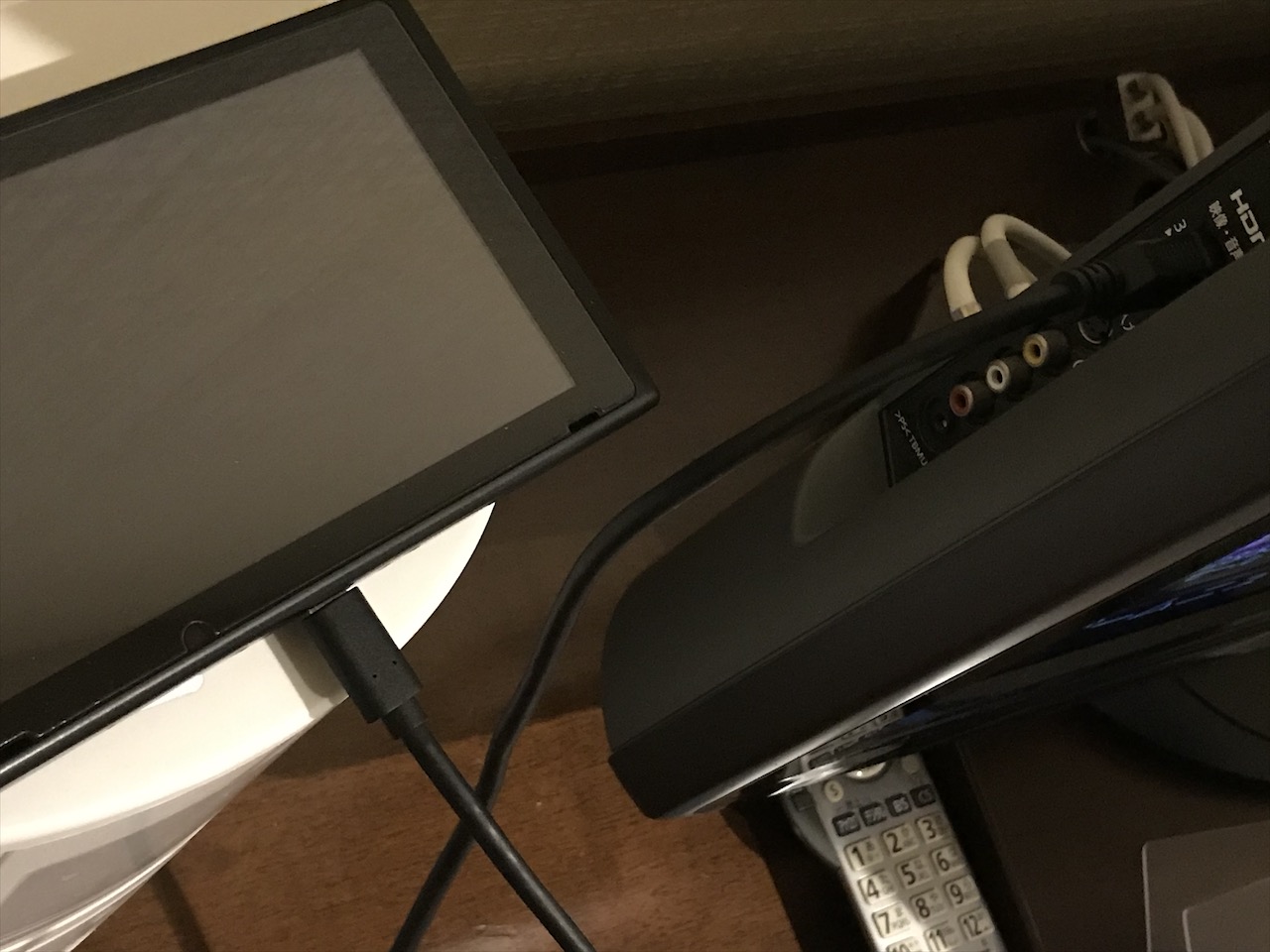 ニンテンドースイッチ本体の下部にUSB TYPE C、テレビ側にHDMIケーブルを差し込むことで準備完了。