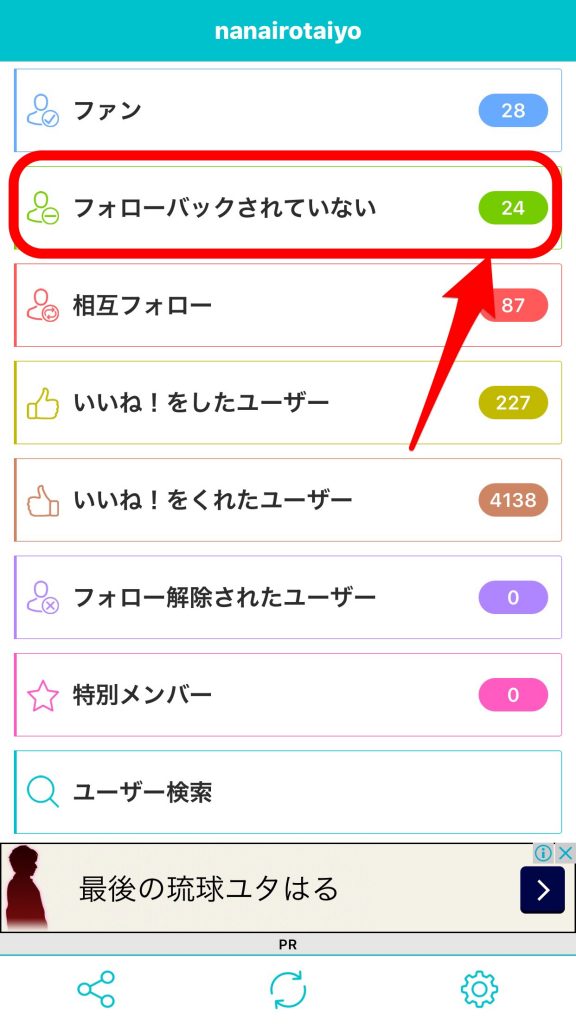 ③一覧からアンフォローしたいユーザーを選んでアンフォローする