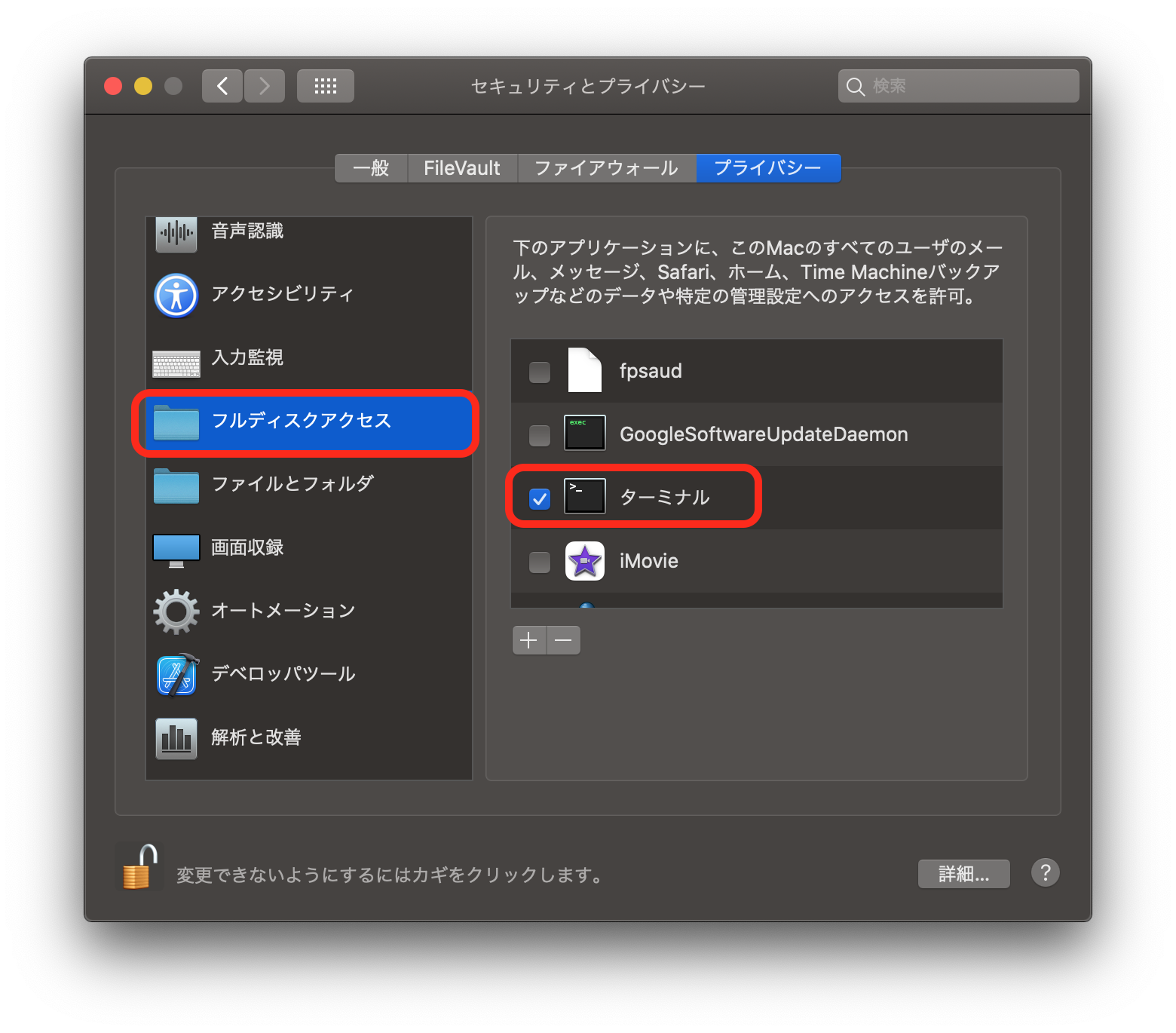 プライバシーのタブに切り替えたら、下の方にあるフルディスクアクセスで、ターミナルアプリをONにします。