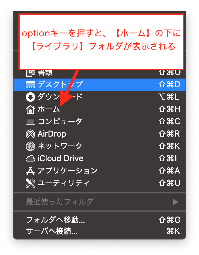 まずはFinderを開き、上のメニュー欄にある「移動」を選択したら、optionボタンを押して表示される「ライブラリ」フォルダを開きます。