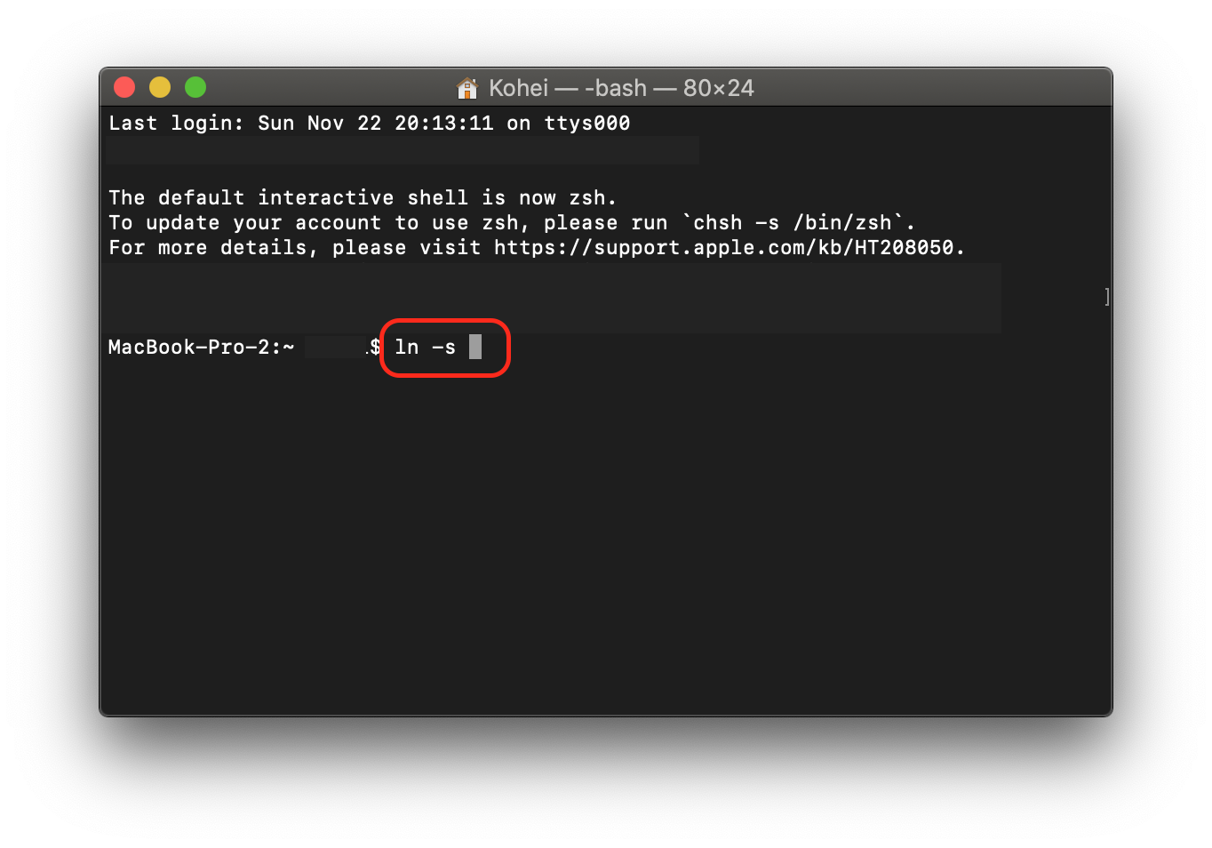 すると、ln -s に続く箇所に赤字のファイルパスが自動的に表示されます。