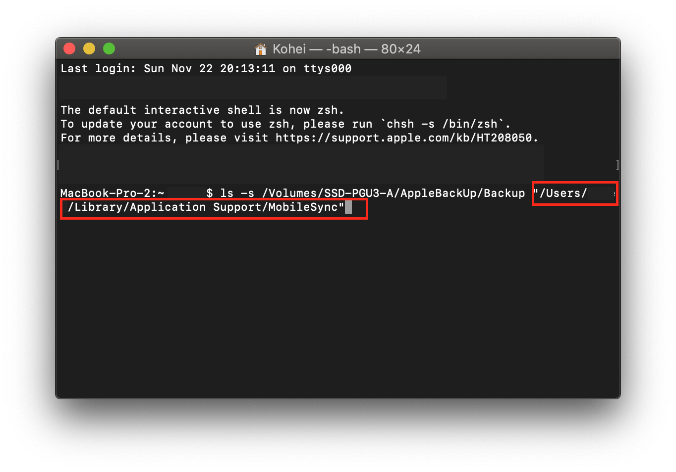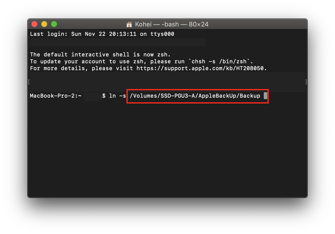 ln -s /Volumes/SSD-PGU3-A/AppleBackUp/Backup "/Users/NanairoTaiyo/Library/Application Support/MobileSync"