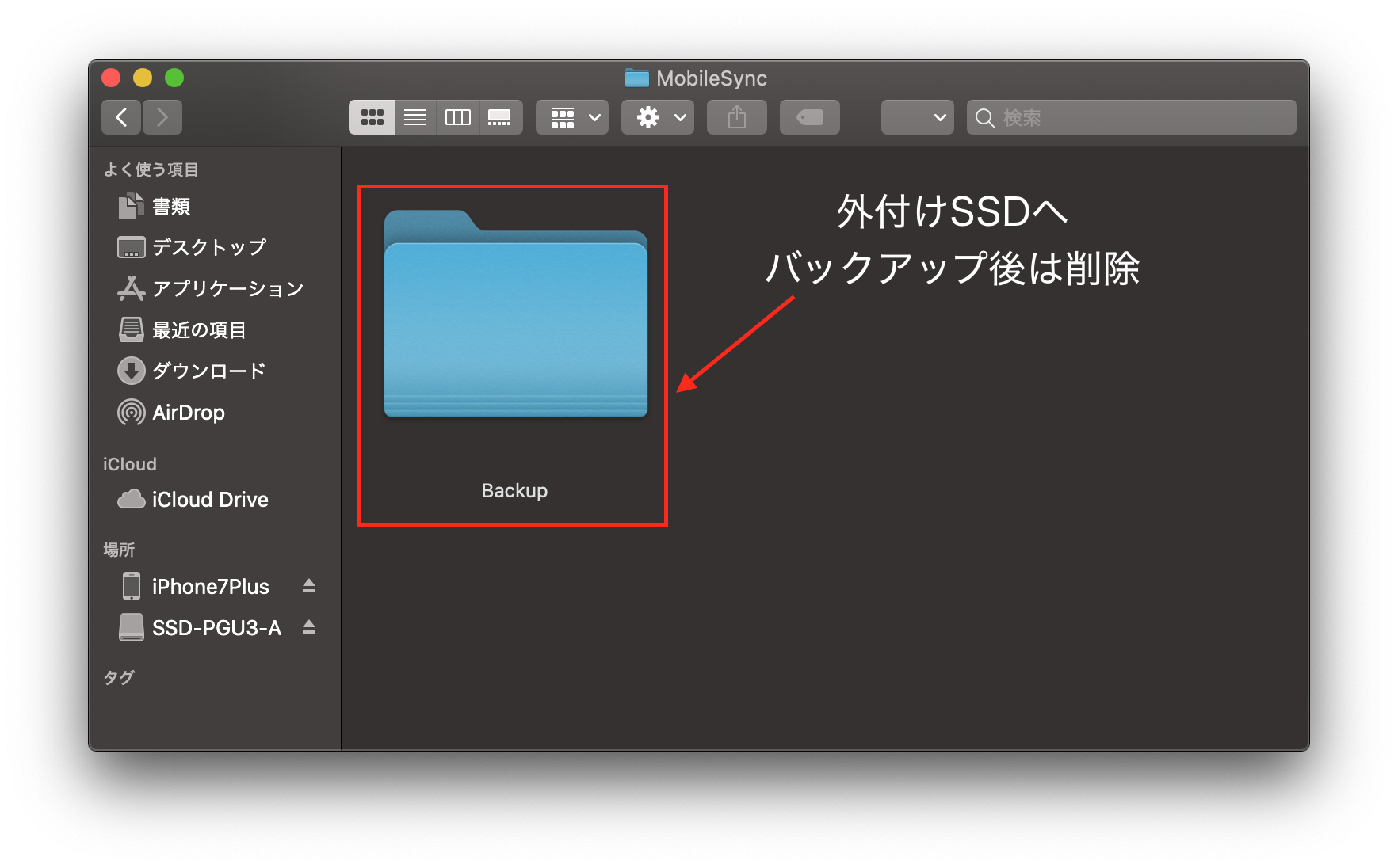そして、先程操作2で開いたMobileSyncフォルダ内のBackupフォルダは削除しておきます。ここで削除しておかないと、次の操作4でエラーが発生します。