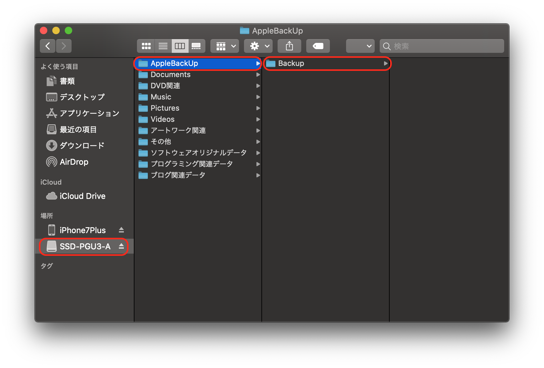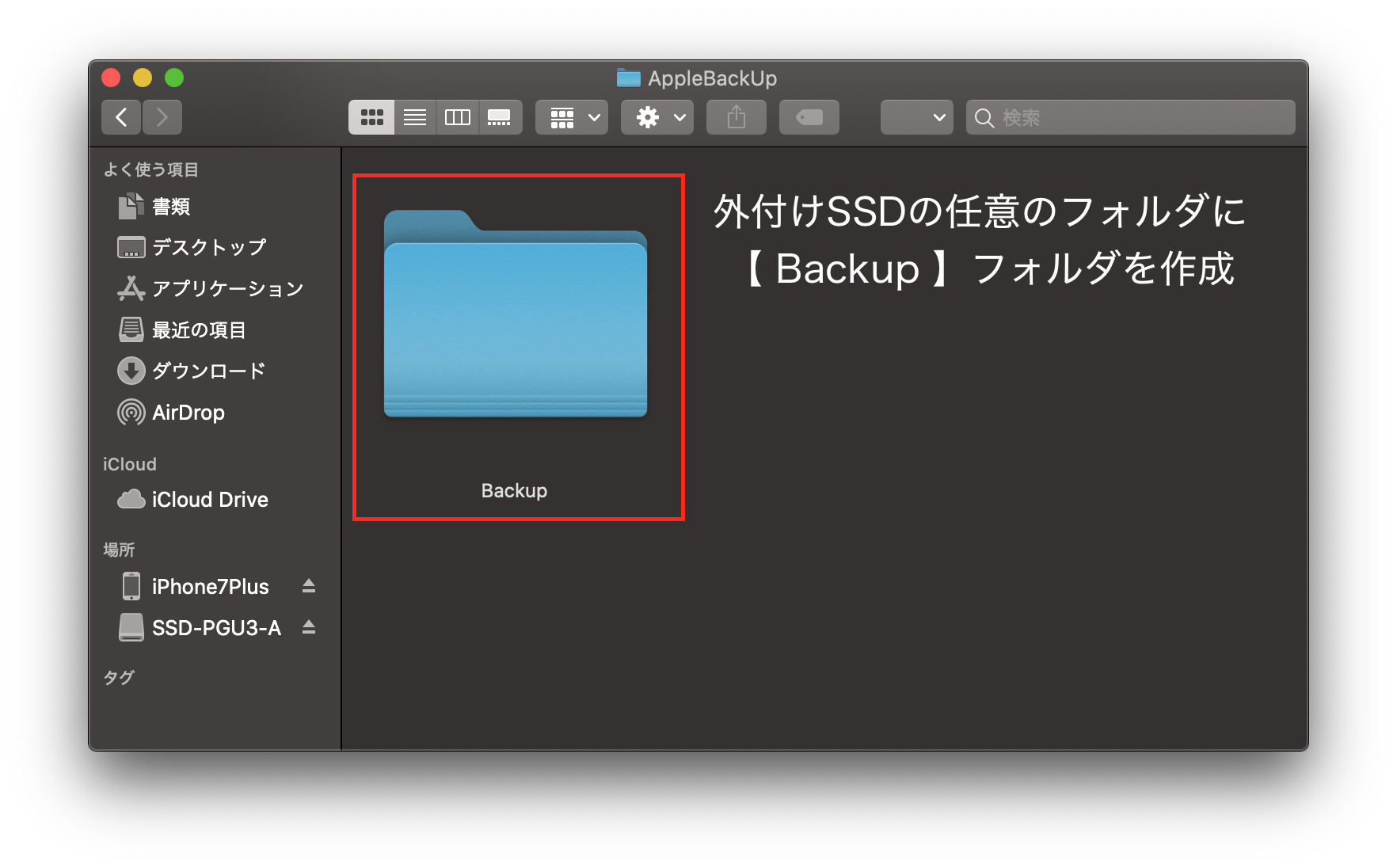 この状態にすることができたら、SSDを接続した後にFinderからiPhoneやiPadの【今すぐバックアップ】を選択するだけで、自動的にSSD内のBackupフォルダにバックアップデータを作成してくれるようになります。