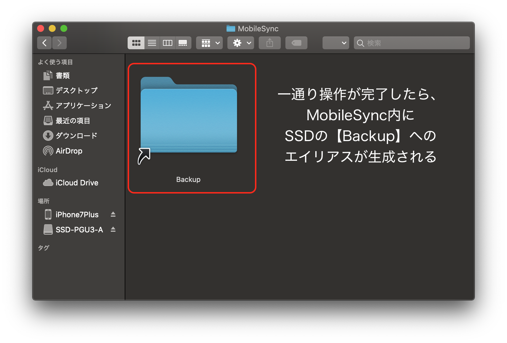 成功すると、SSD内に生成したフォルダにあるBackupフォルダへのエイリアス(ショートカット)が元の保存先MobileSync内に自動生成されているはずです。