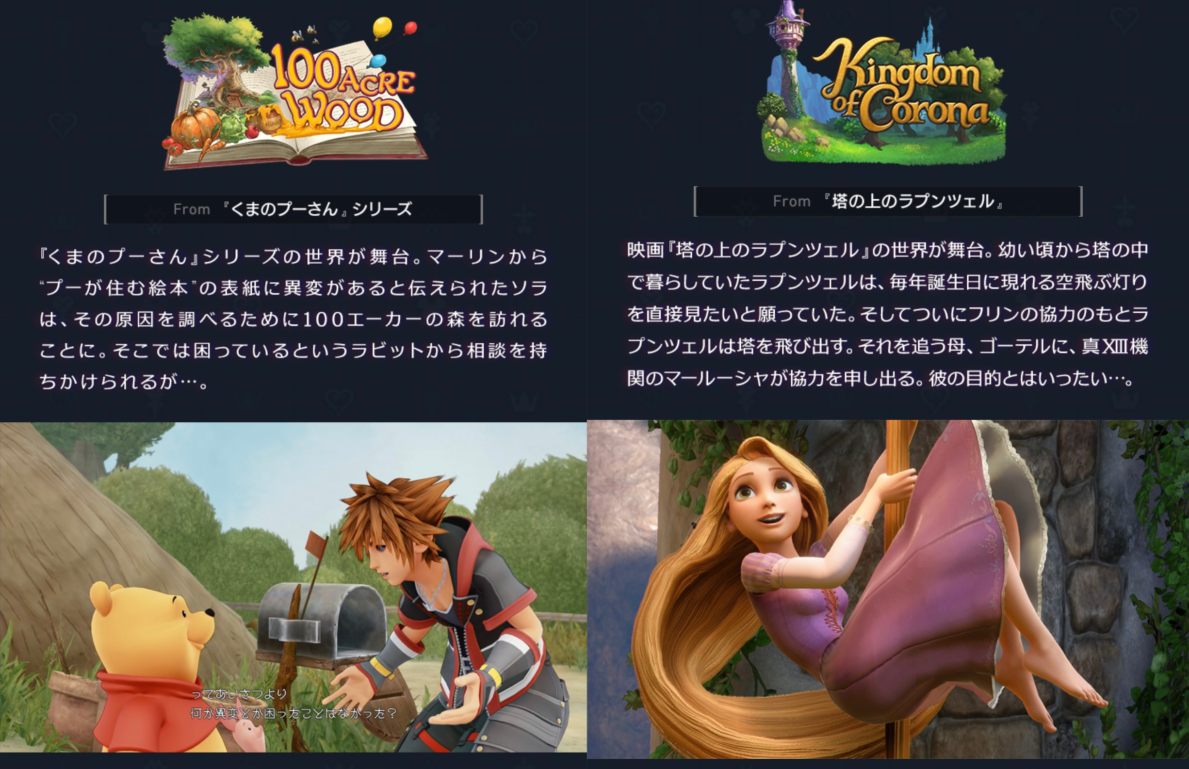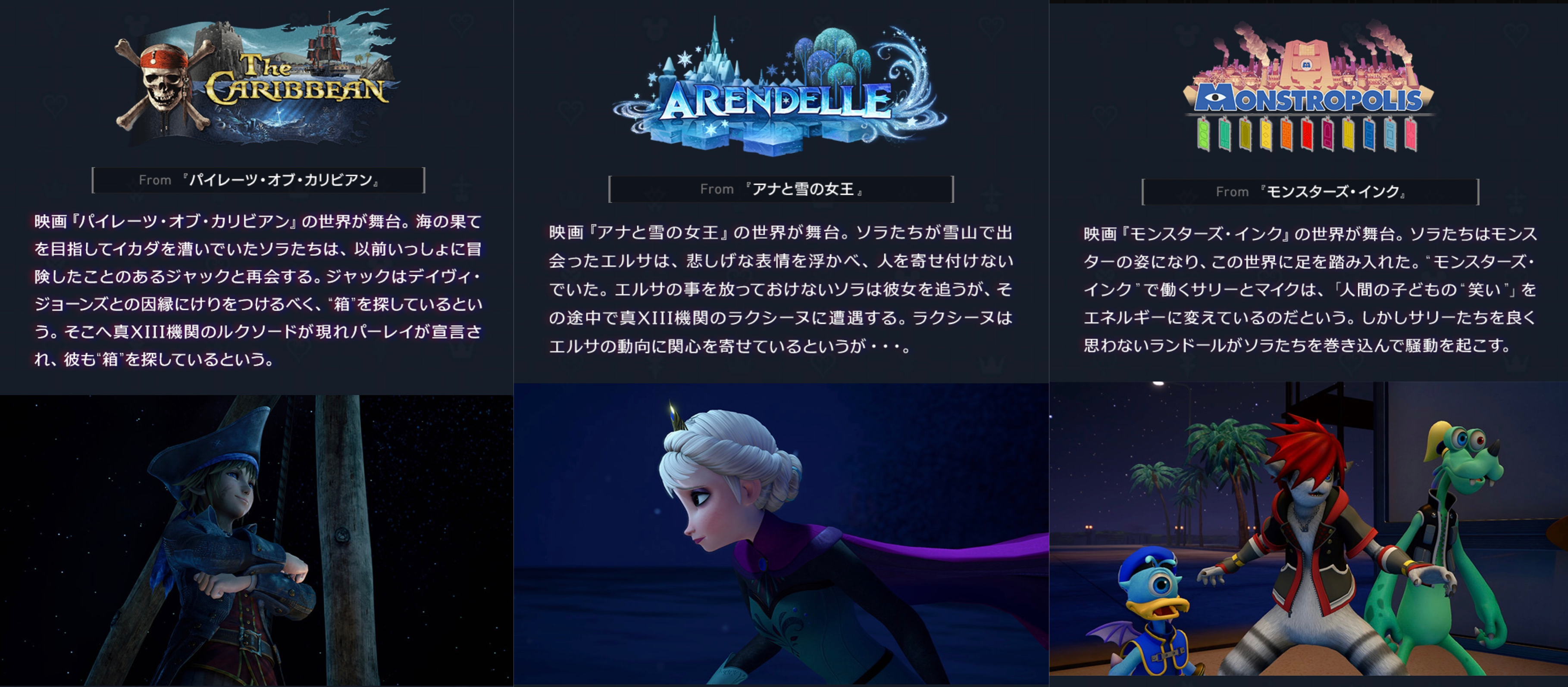 ワールド自体は過去作と大きく変わっていて、主に最新のディズニー映画の世界中心に据えられているようです。アリスやアラジン、アリエル、ピノキオといった昔ながらのディズニー作品の各ワールドは選考落ちの模様。今作で採用された新しいワールドにはピクサー制作のディズニー作品が多用されています。