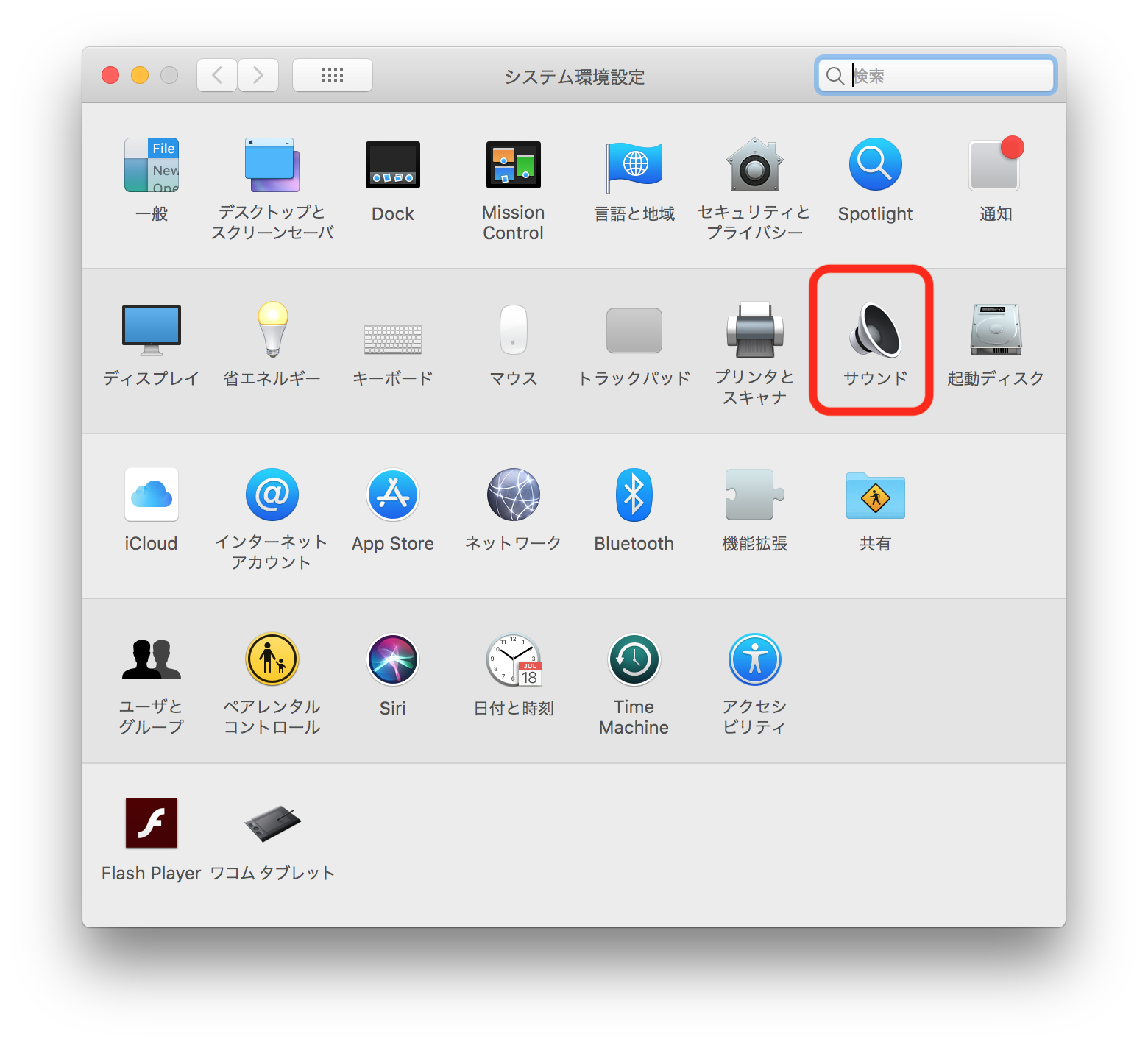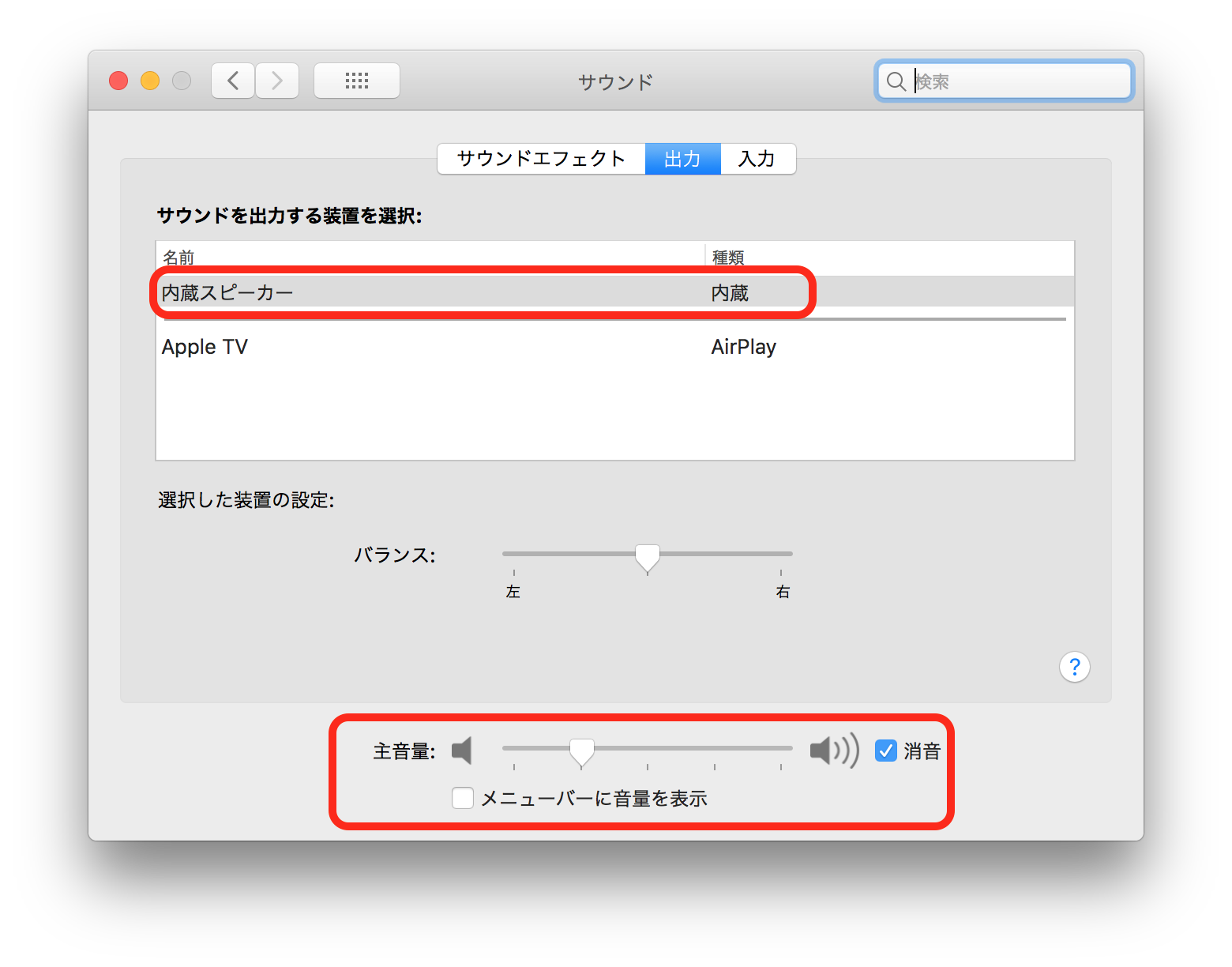 音量・サウンドの設定は「システム環境設定>サウンド>出力」の順で開いてきます。