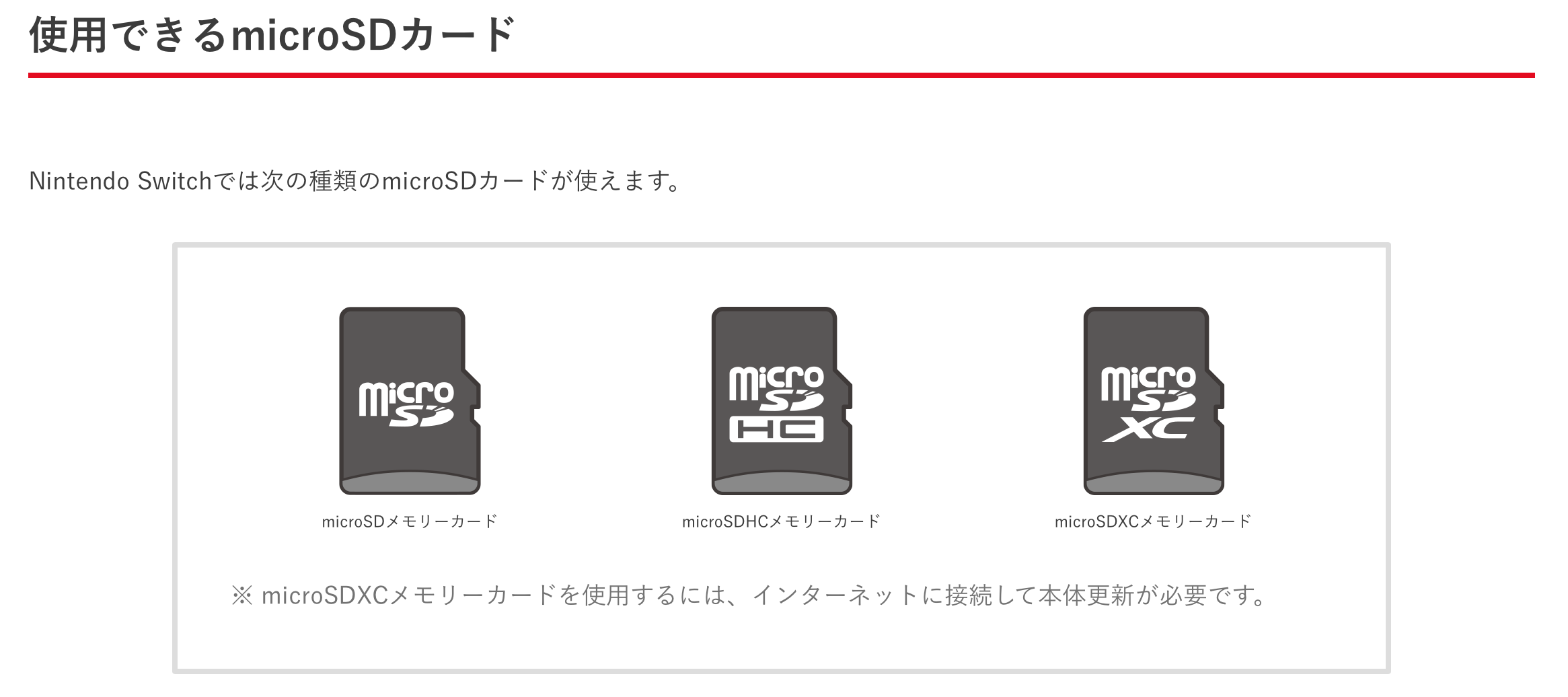 ニンテンドースイッチで使用可能なメモリーカードは以下の3種類です。