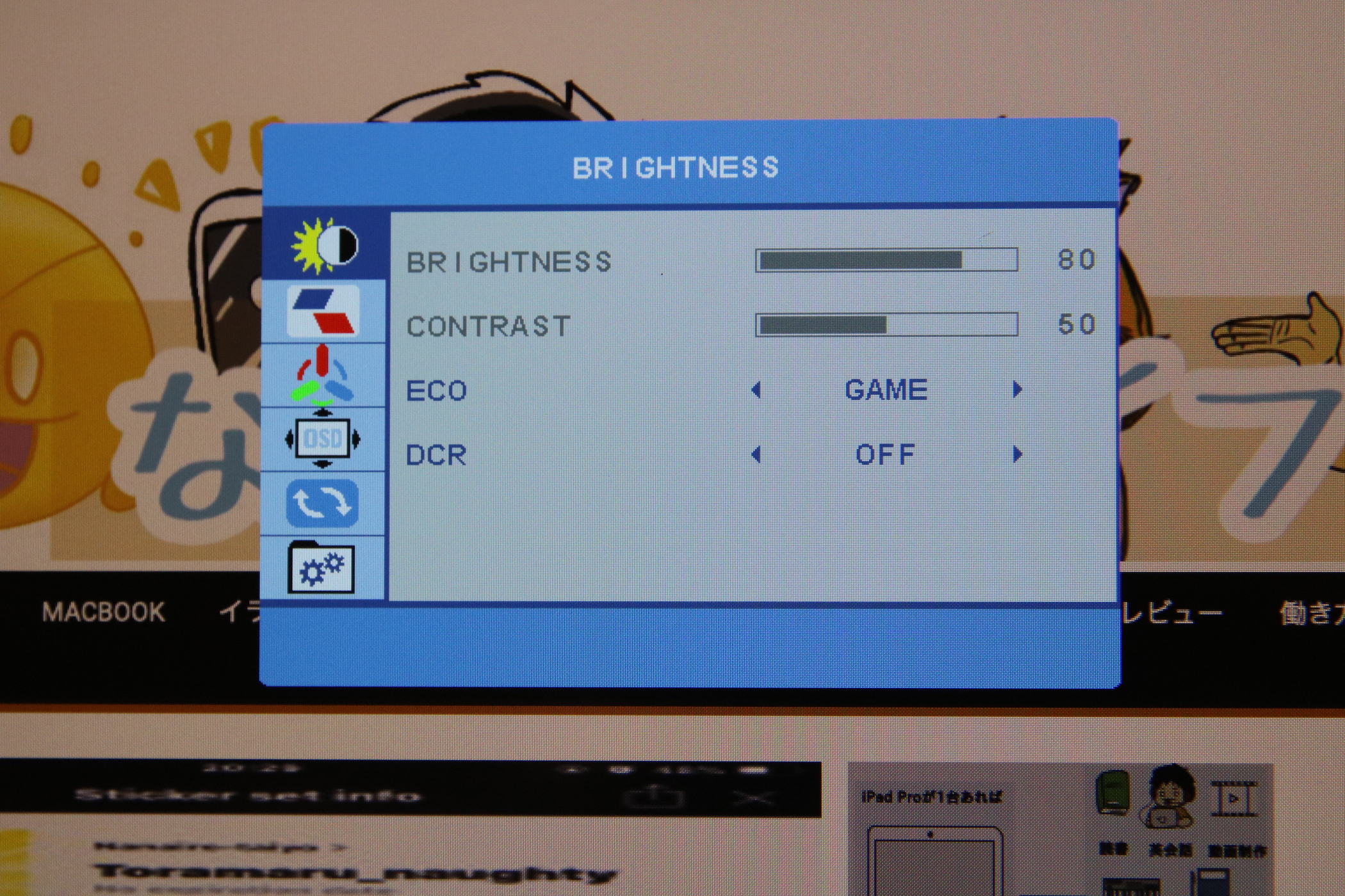 明るさ(BRIGHTNESS)設定のECOモードをGAMEに変えてみましたが、その後ニンテンドースイッチに接続した際の色味がよろしくなかったため、STANDARDに戻しました(初期設定)。