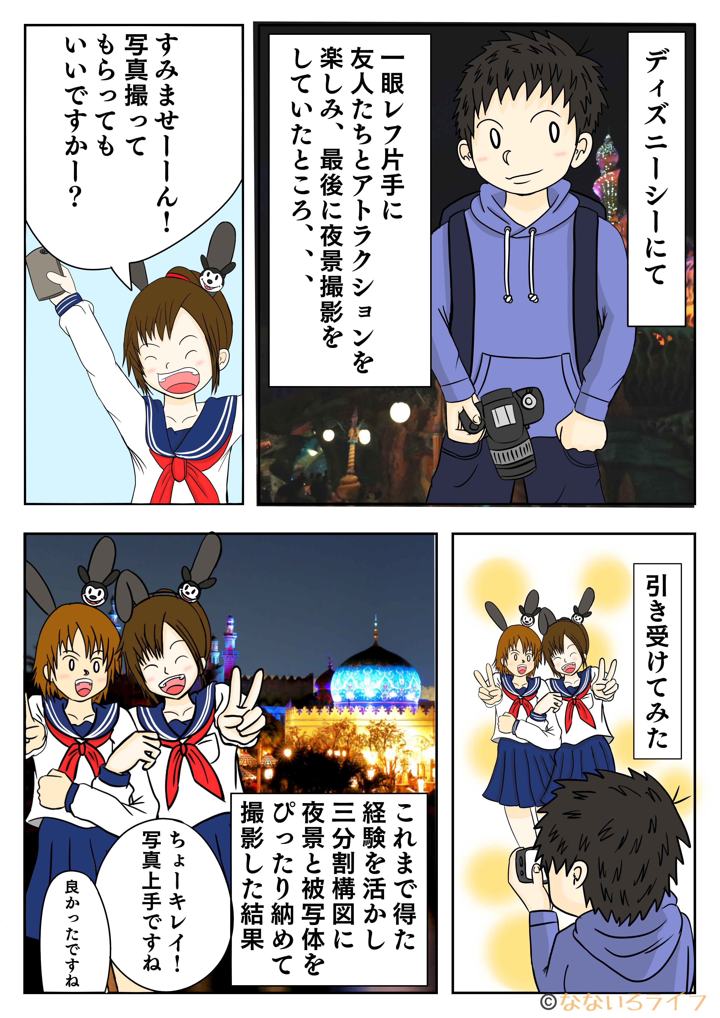 一眼レフで写真を撮って回っていたからか、女子高生2人組に写真の撮影をお願いされ、受け取ったスマホで三分割構図を意識して撮影しました。