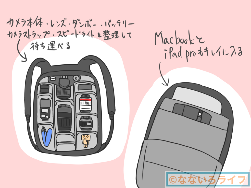 試しに今持ってるレンズや小物、MacBookやiPad Proまで詰め込み詰め込み。