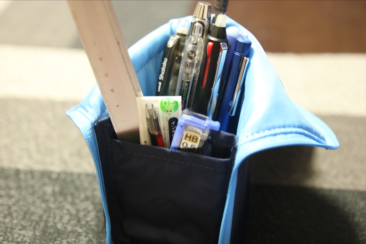 ペン立てとして利用する際には、筆箱上部を捲りあげることですっきりとしたデザインに変えることができました。手前側のポケット部分は定規・シャー芯ケース・消耗品等を入れることでペンと切り分けながら管理できる点も評価ポイント。