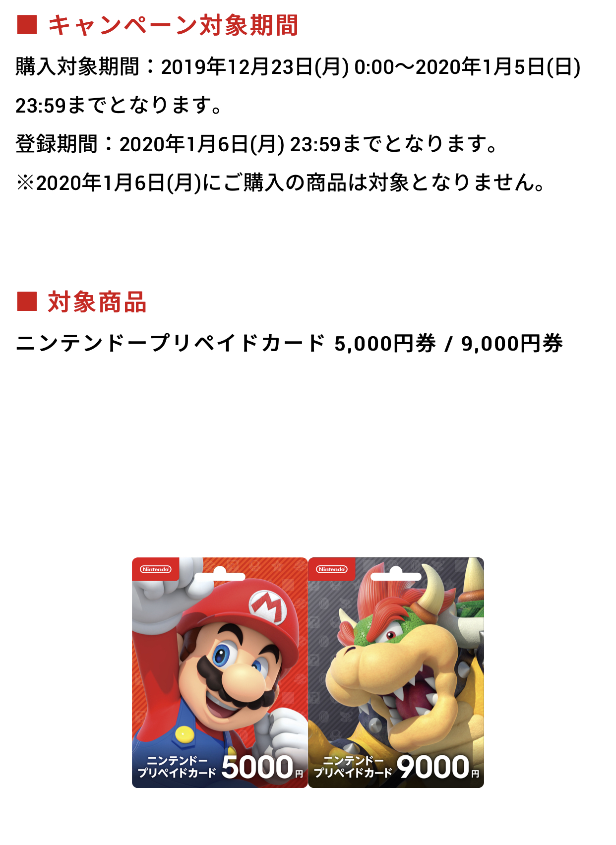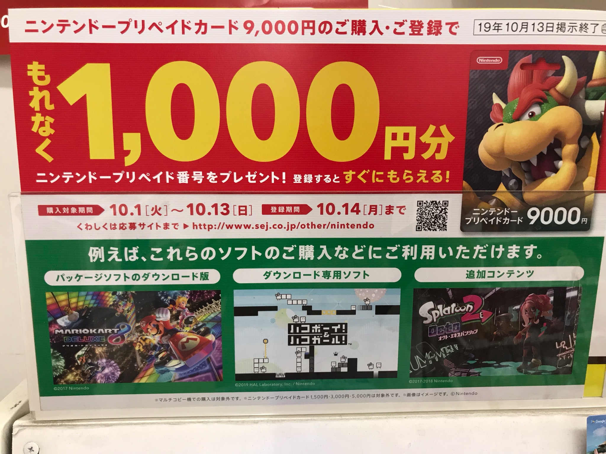 2019/12/23〜1/5までの期間限定でニンテンドープリペイドカードクッパ(9000円)をセブンイレブンで買うと、1000円分のニンテンドーeショップポイント番号がもらえるキャンペーンが開始されました。