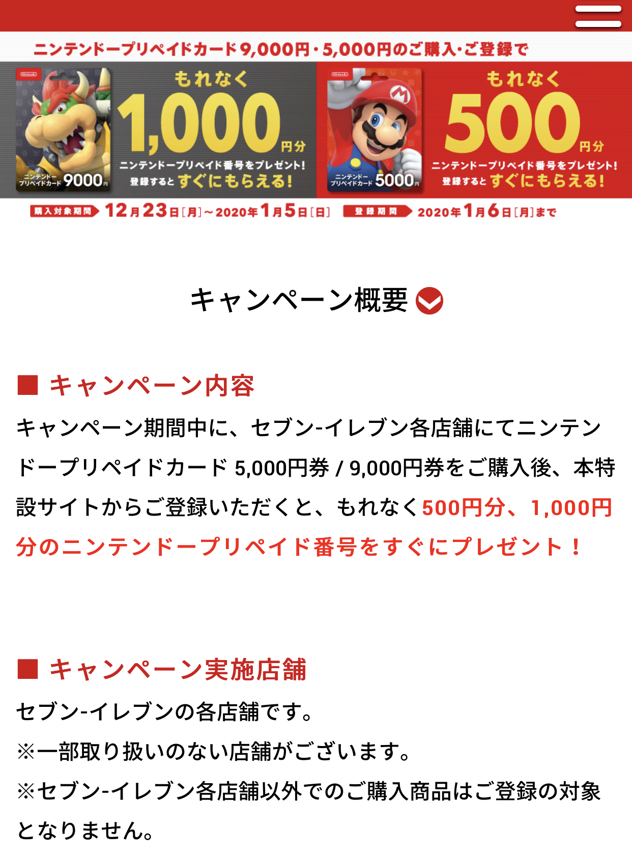 キャンペーン期間中に、セブン-イレブン各店舗にてニンテンドープリペイドカード 5,000円券 / 9,000円券をご購入後、キャンペーンサイトからご登録いただくと、もれなく購...