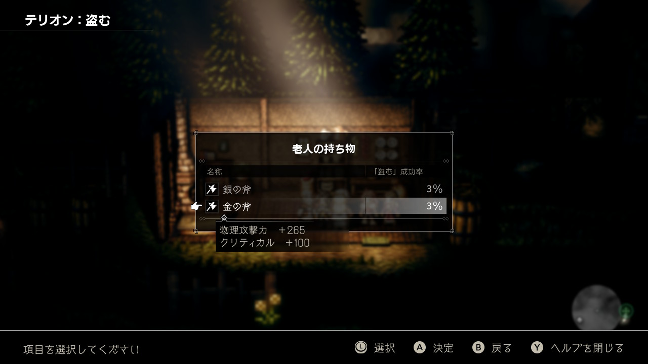 中にいた老人に対しテリオンの「盗む」サーチかけてみると「銀の斧」「金の斧」を持っていましたが、盗める確率はなんと3%、、、