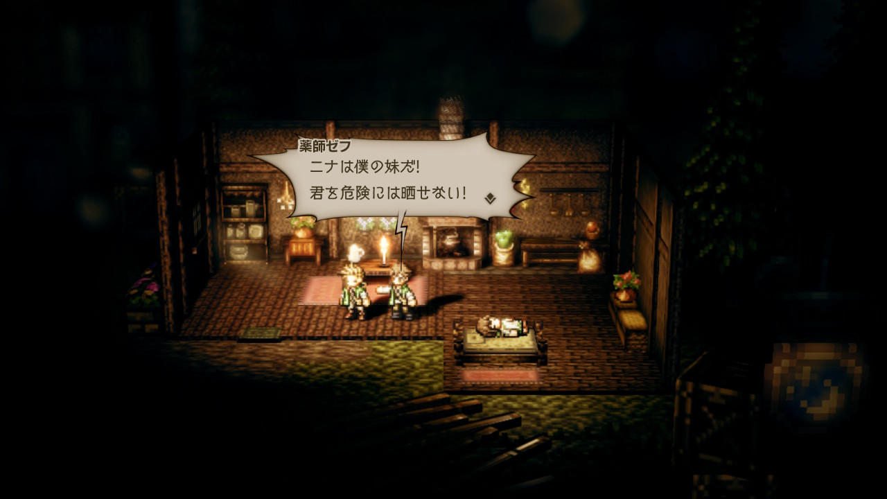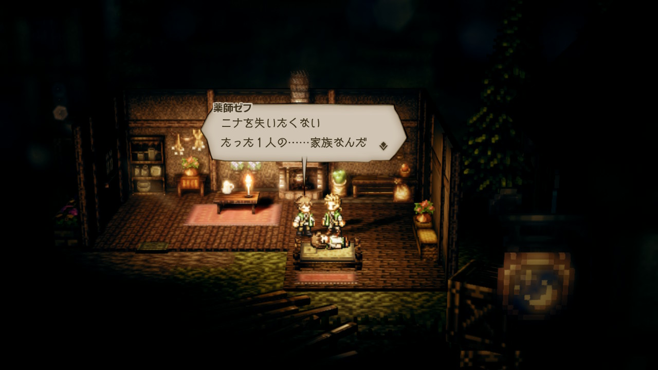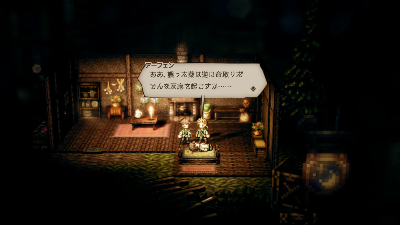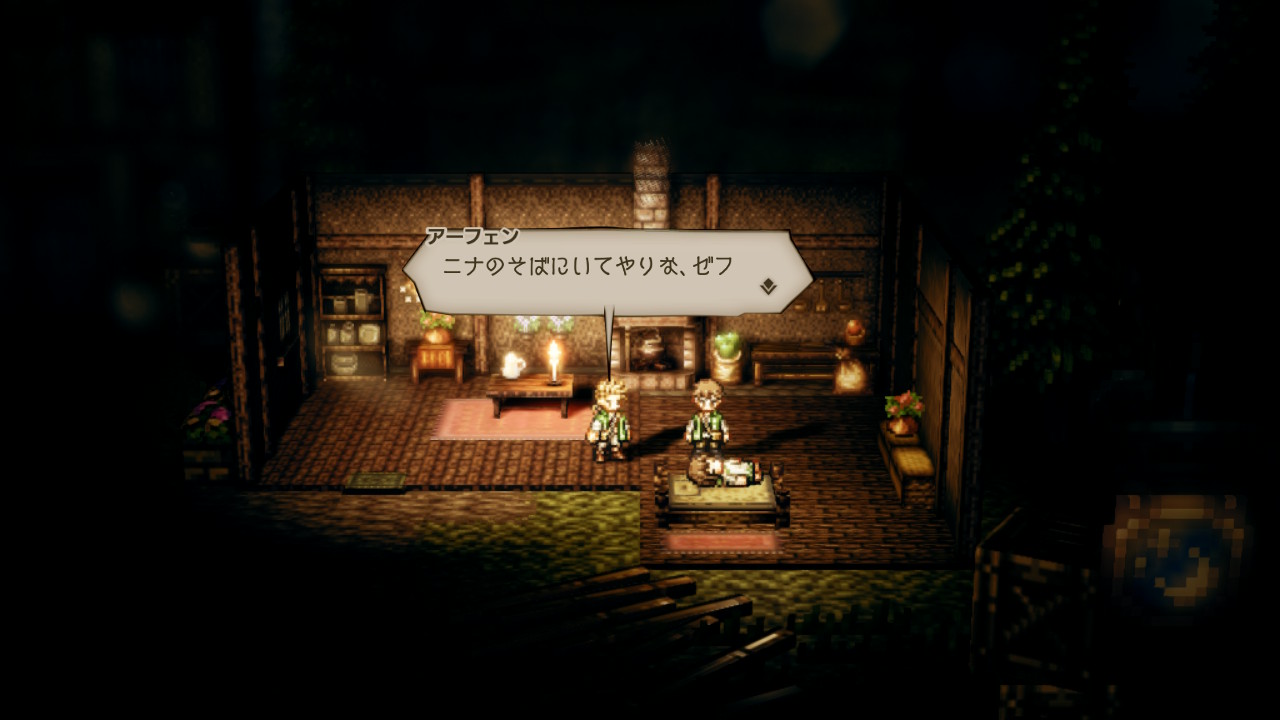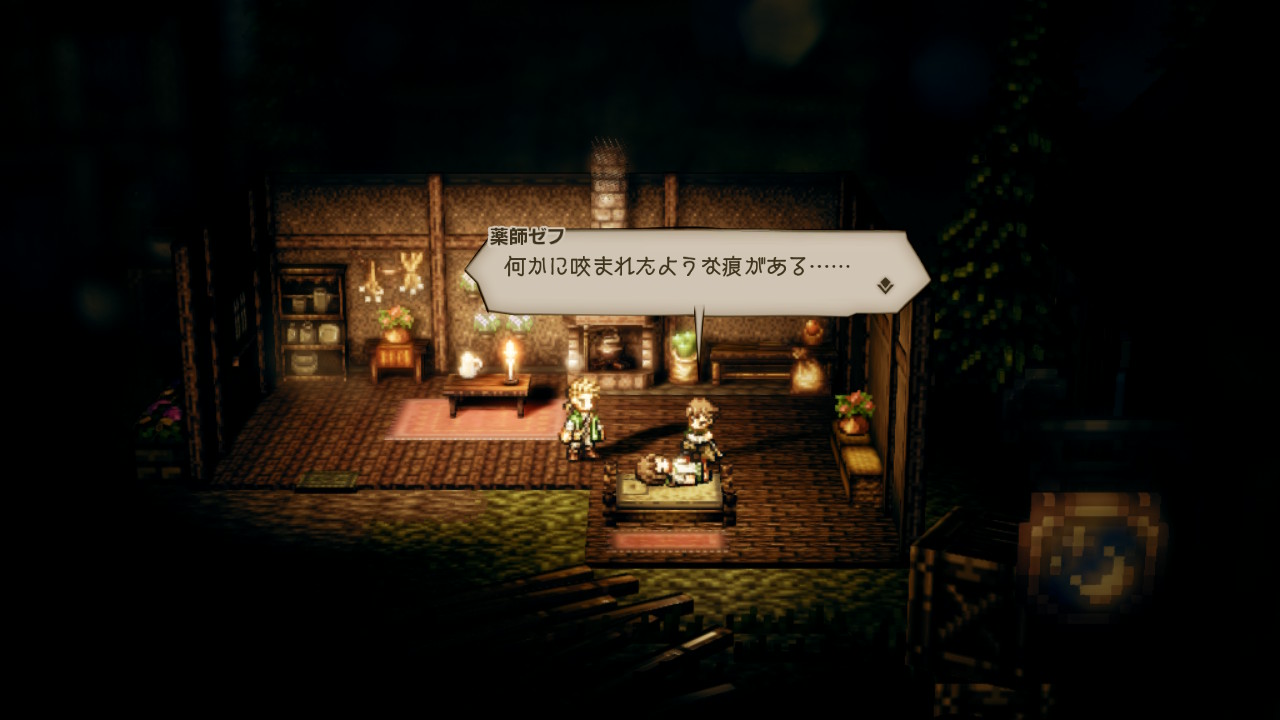 唯一の家族であるニナの身を考えると、心配で仕方ないゼフと親友のアーフェン。ニナが何に噛まれたか調査するため、アーフェンのフィールドコマンド「聞き出す」が解禁されました。