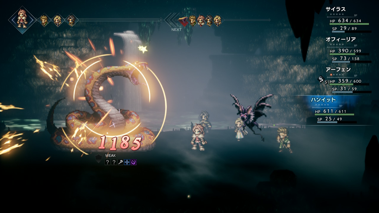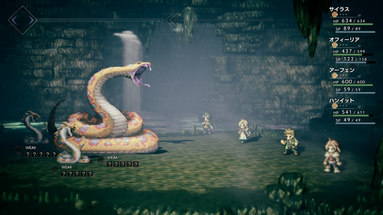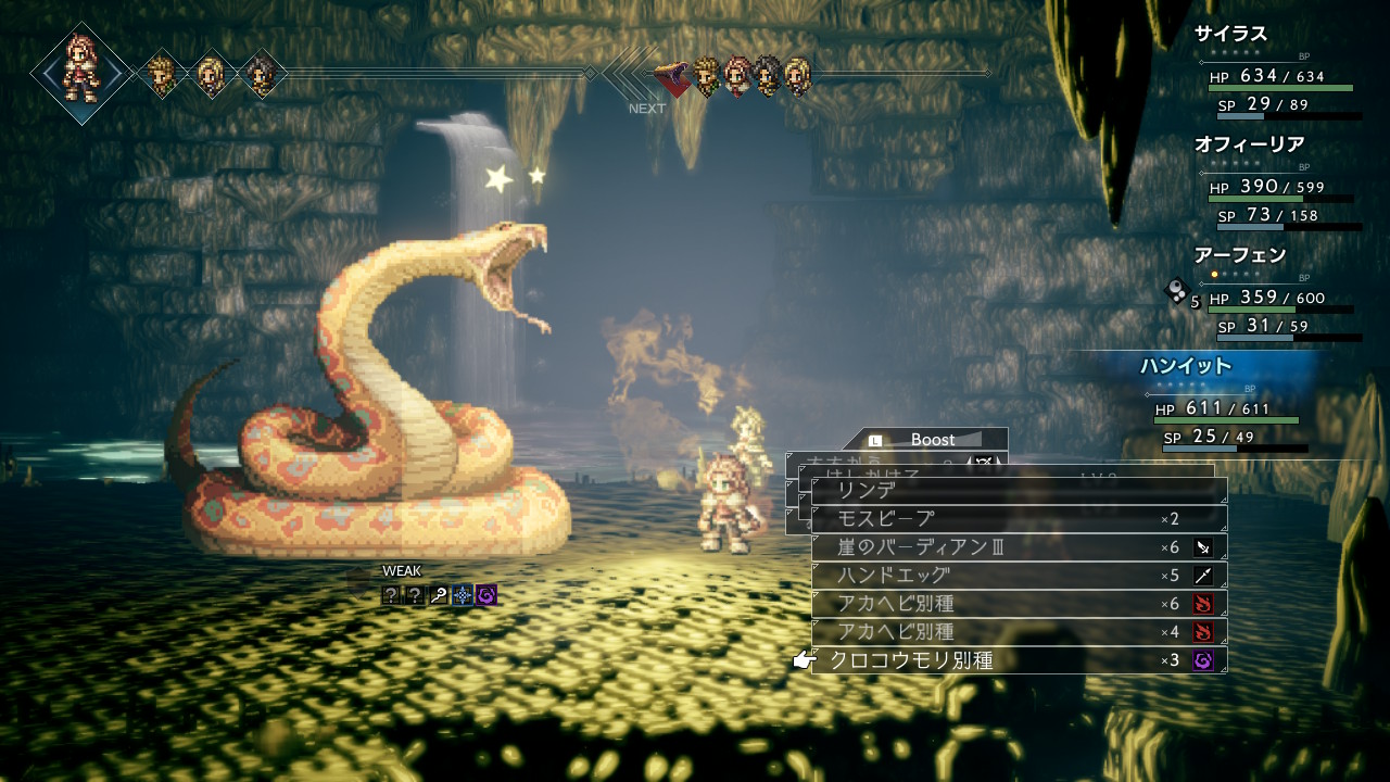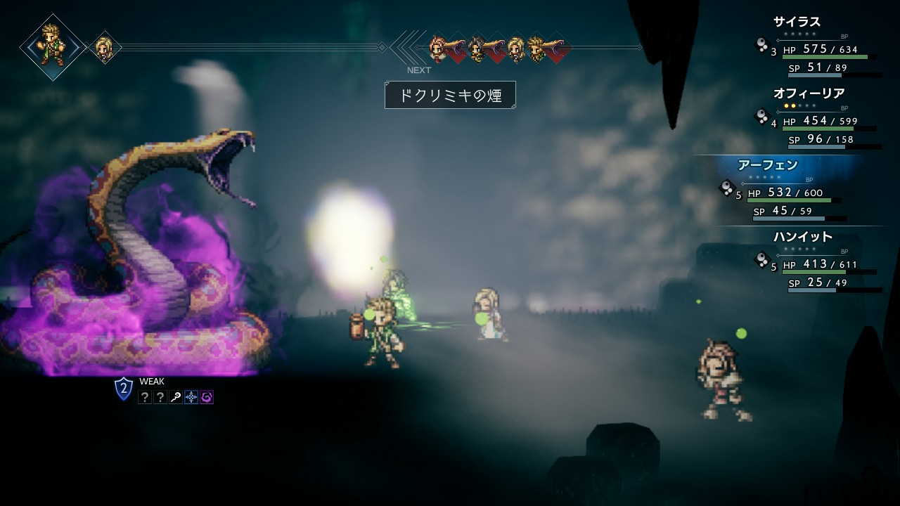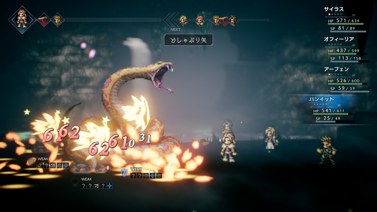 マンダラヘビの後ろにいる小さいヘビ2匹は弓矢と氷に弱いので、序盤から全体攻撃でゴリゴリと弱点を突きにいきます。
