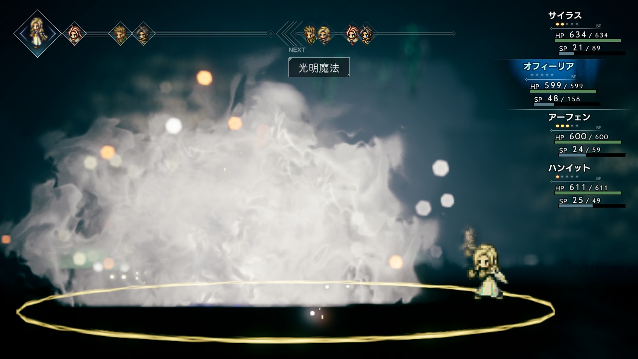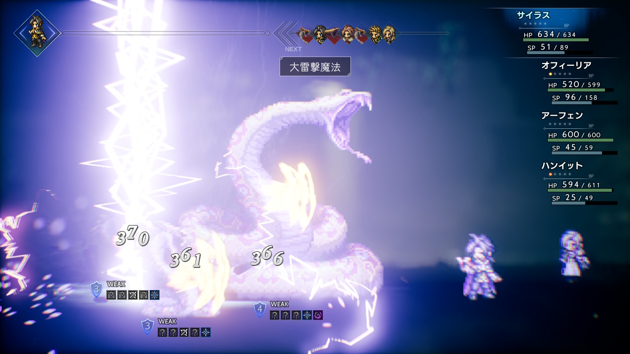事前にハンイットにどしゃぶり矢を覚えさせておくと戦闘が楽になります。サイラスも大氷結魔法を覚えていたら良かったのですが、大火炎魔法と大雷撃魔法までしか持っておらず、ブーストかけての大雷撃魔法でしのぎました。