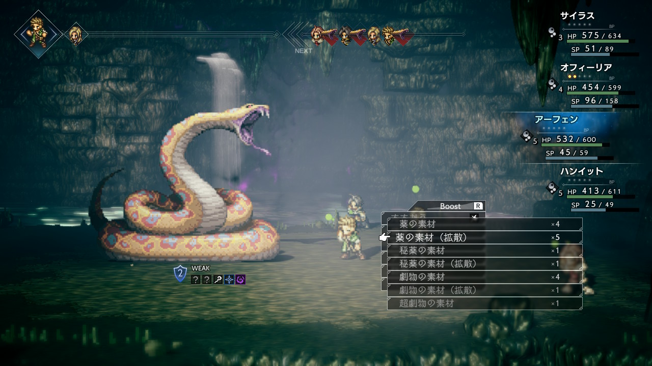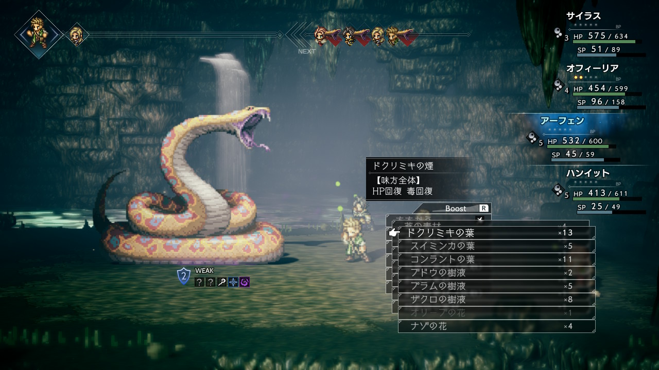 パーティー全体が毒状態にされたら、行動のたびに100近いダメージを受けますので、アーフェンの調合の出番。