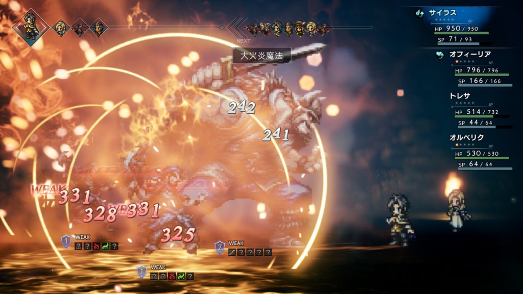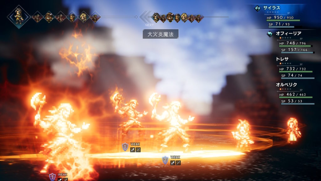 周りの雑魚モブ盗賊は炎と風が弱点なので、大火炎魔法で風よびでガツガツ殴っていきます。
