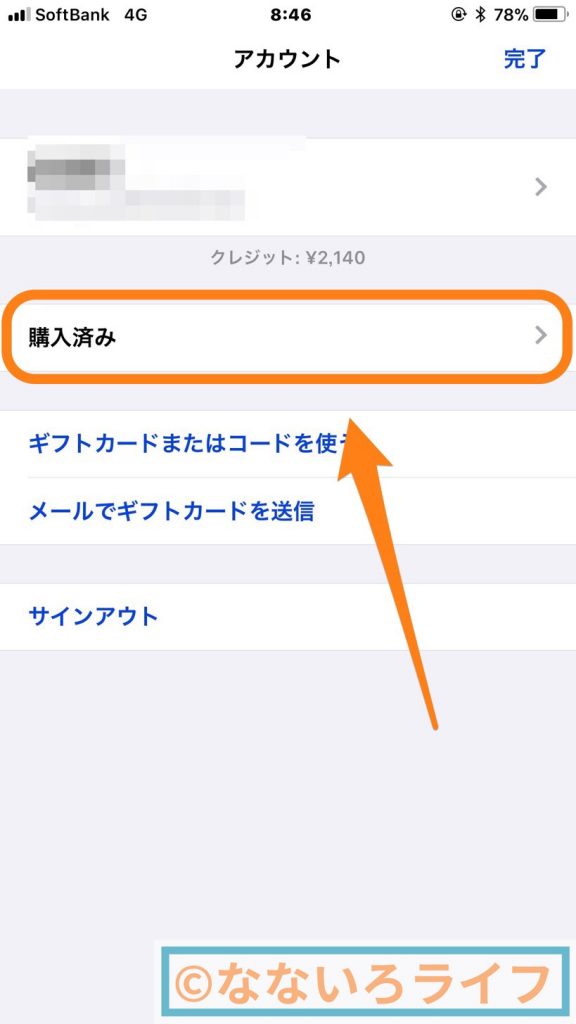 アカウント情報が開かれますので、【購入済み】をタップ。