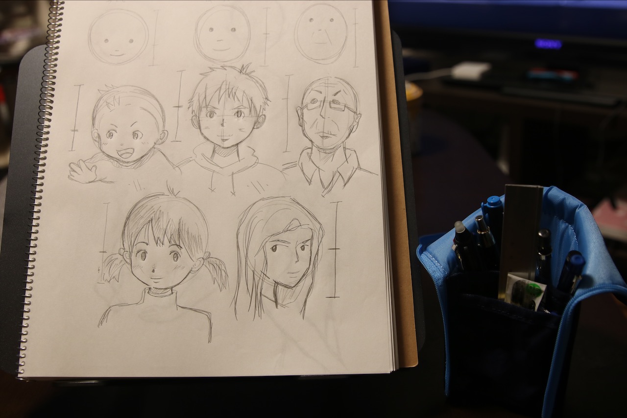 こちらは「アニメ私塾塾流 最速でなんでも描けるようになるキャラ作画の技術」という本を参考にイラストを描く練習に使っているクロッキーノートの1ページ。