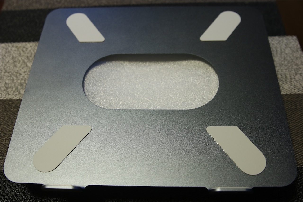中央部の切り抜きは排熱用とのこと。アルミ合金素材のため、重さも最低限に抑えられているのが嬉しいところですが、持ち歩くには難しそう。外で作業する際に持ち歩くには相応の覚悟が必要となります。