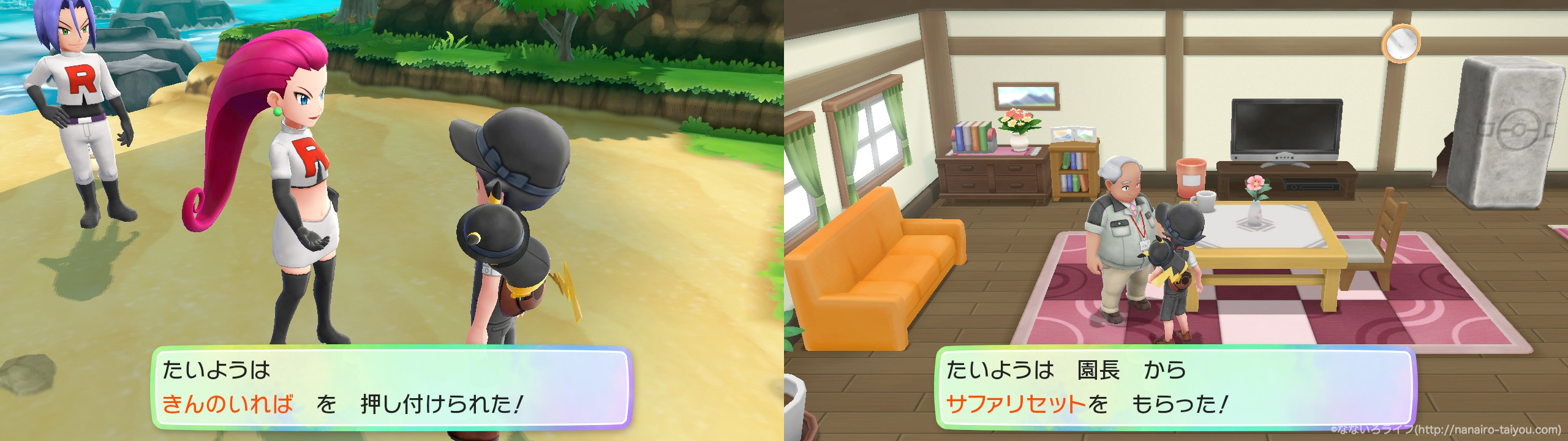 そのため、海岸付近に足を運んで、ロケット団の2人から「きんのいれば」をもらいに行きましょう。