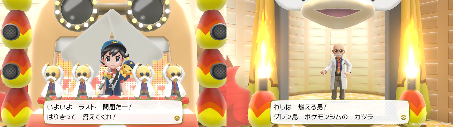 クイズに答えて正解するとトレーナーとの戦いもなくカツラと戦うことができます。