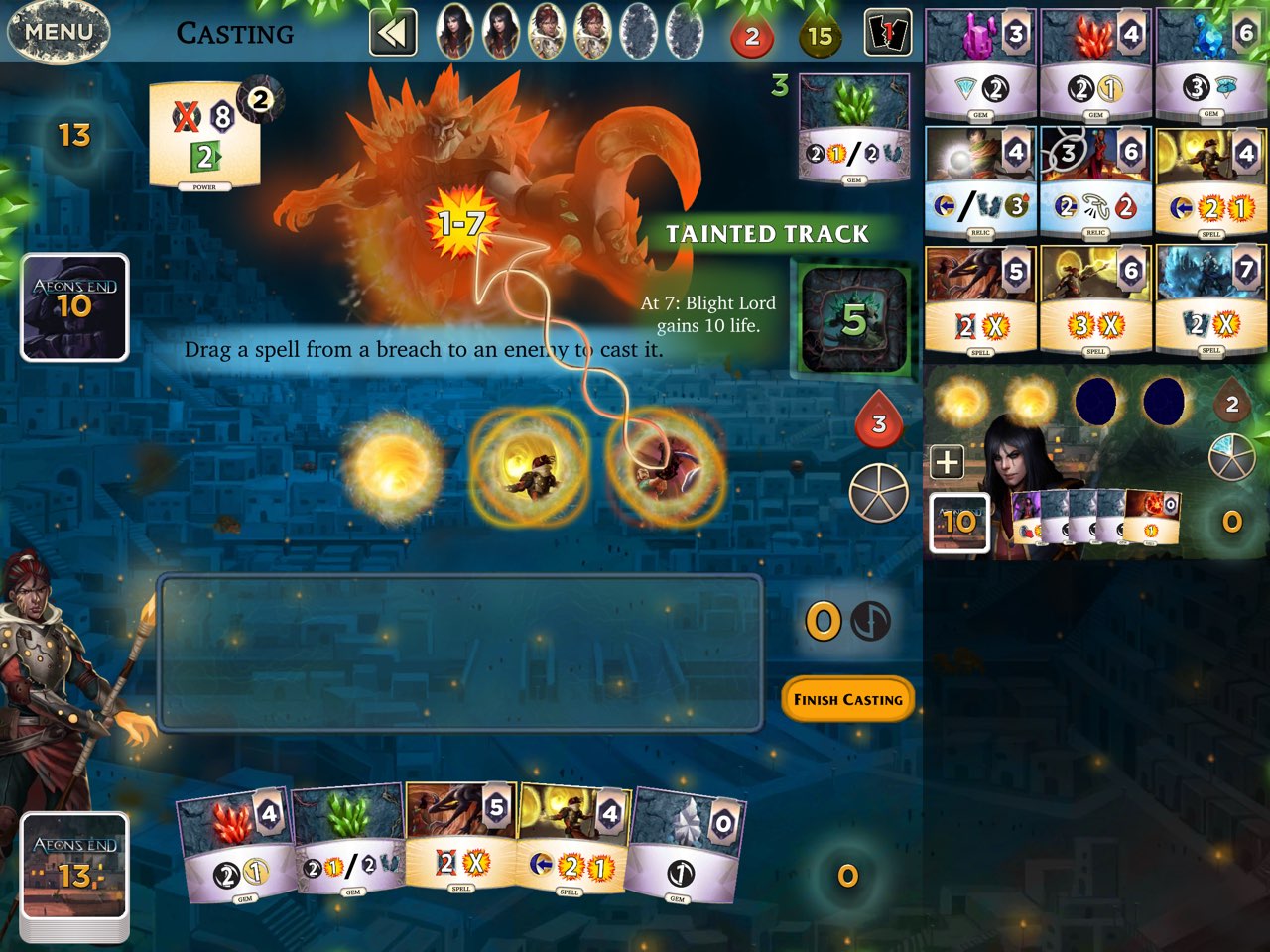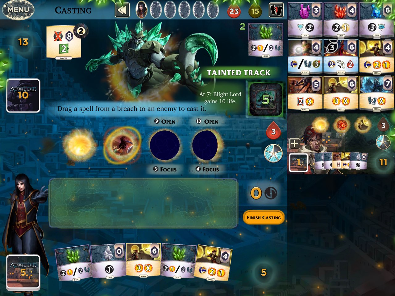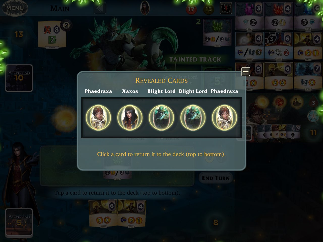 できるだけ序盤に高火力の魔法を獲得して、モブネメシスを早めに焼き払いながら、「TAINTED JADE」を2エーテル支払って返還するというテクニカルな戦いを求められるので、行動順次第でゲーム展開が大きく変動します。
