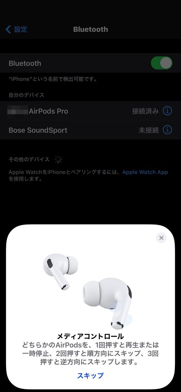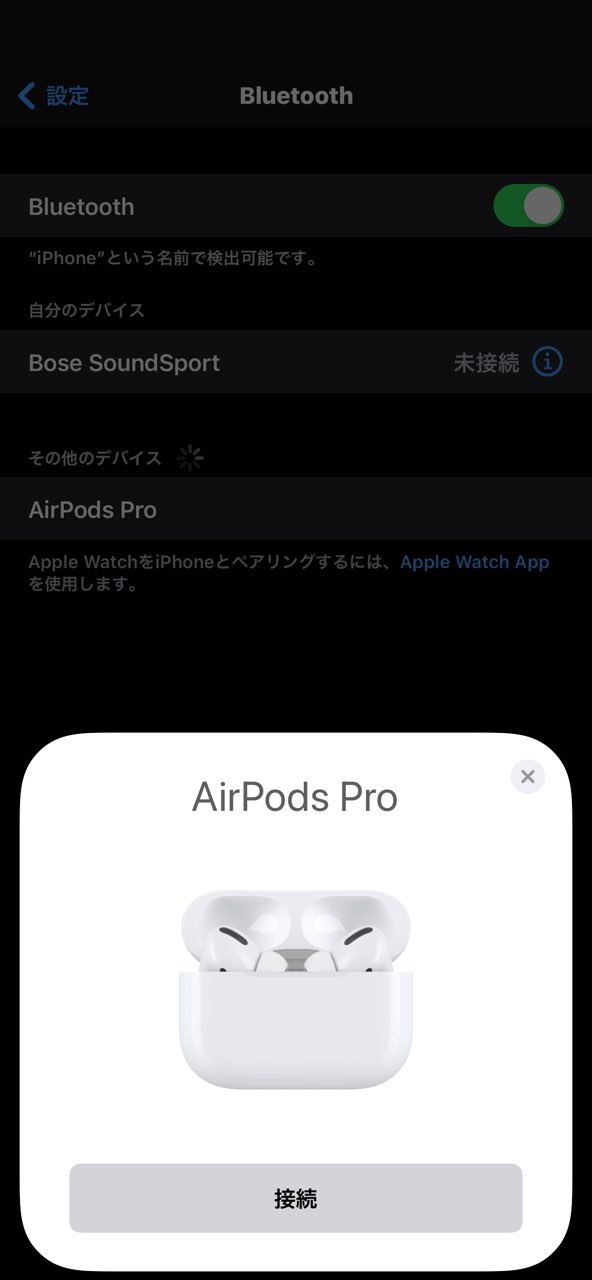 手持ちのiPhone 12 Pro MaxとAirPods Proを接続してみました。接続方法はとても簡単で、本体同士を近づけて、AirPods Proの蓋を開いた状態で、iPhone画面の「接続」をタップするだけで完了します。