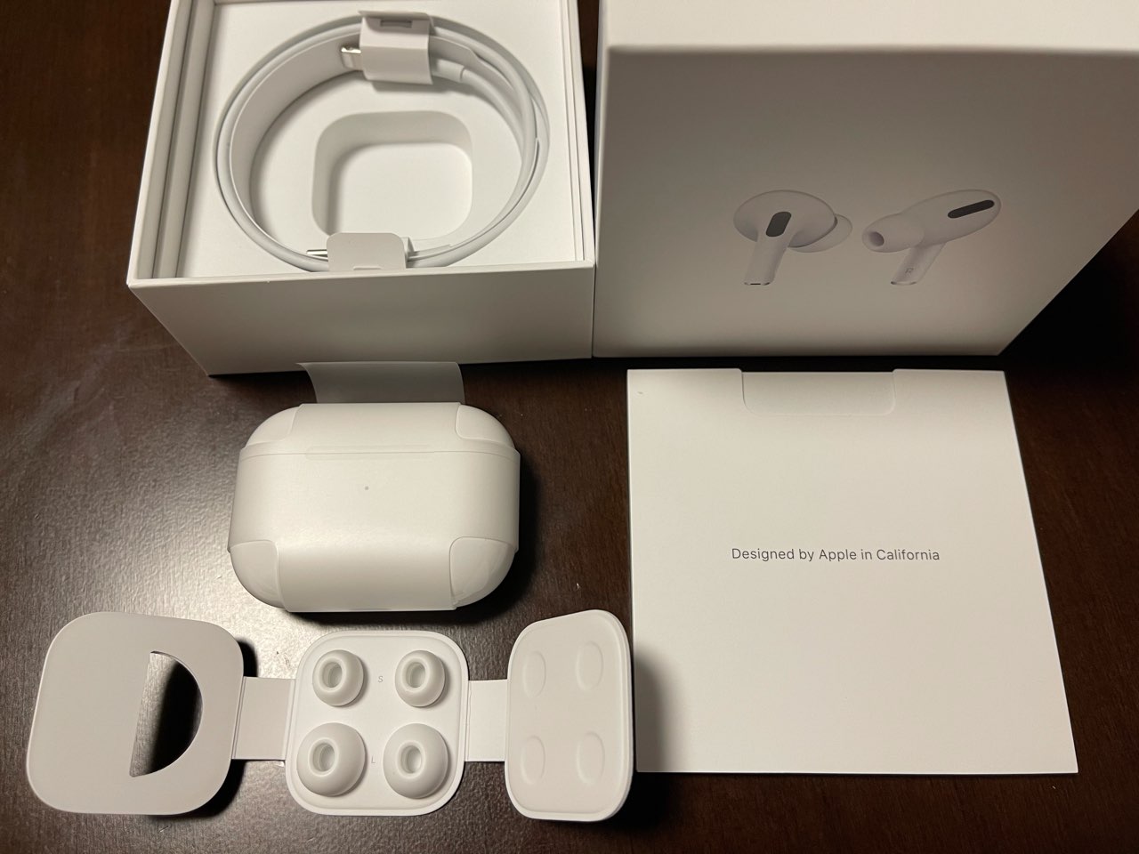 AirPods Pro、充電ケース、替えのイヤホン、ライトニングケーブル、取扱説明書が入っています。