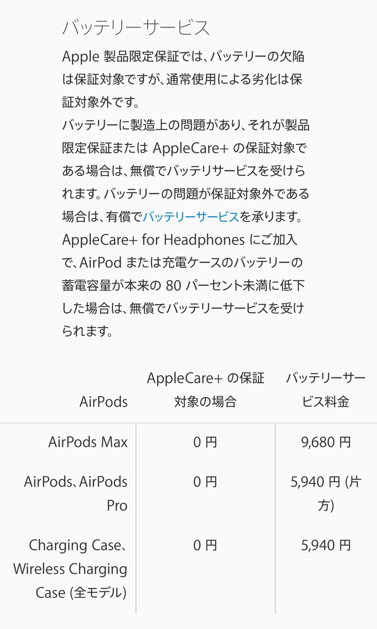 AppleCareに加入していれば、いずれのバッテリー交換(という名の新品交換)をしてもかかる費用は「0円」!!新品交換を前提にすれば、AirPods Proのコスパは普通に買うより格段に向上することが見込めます。