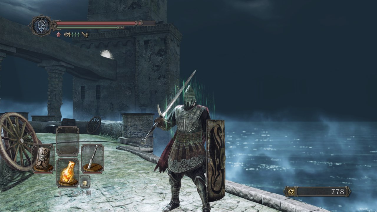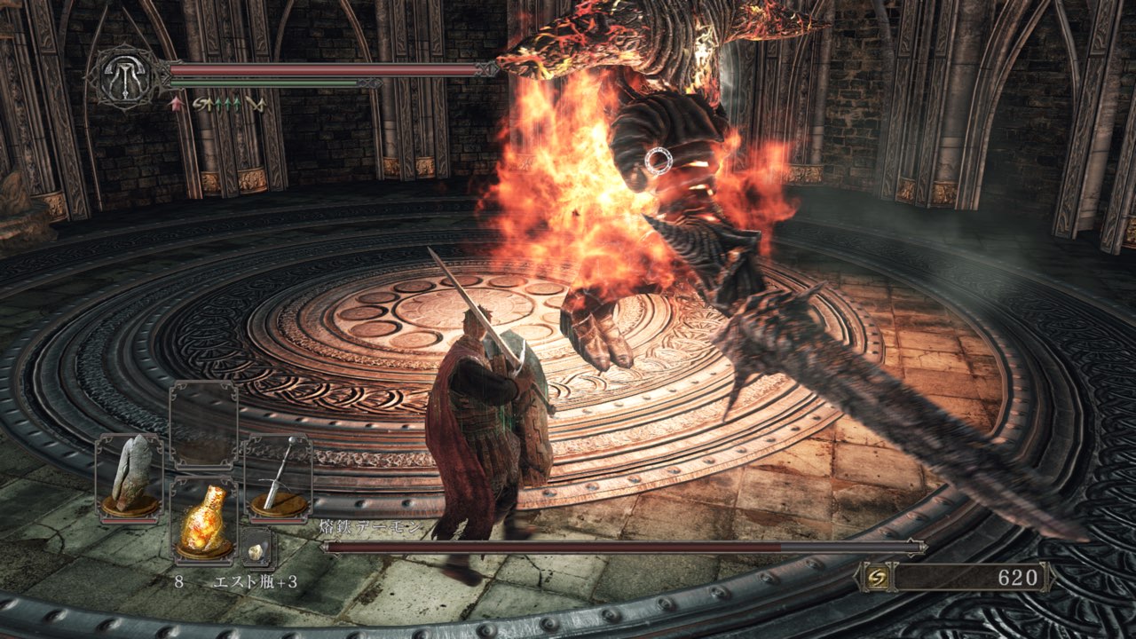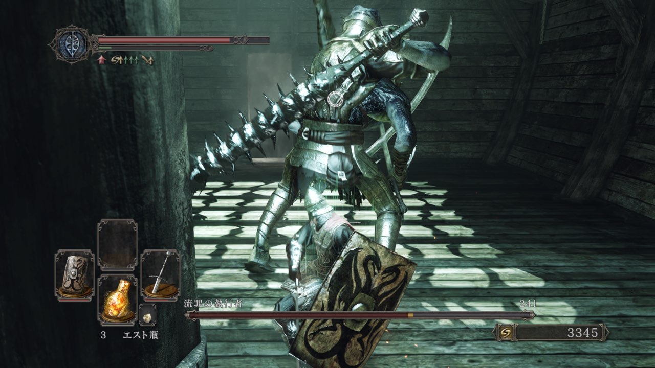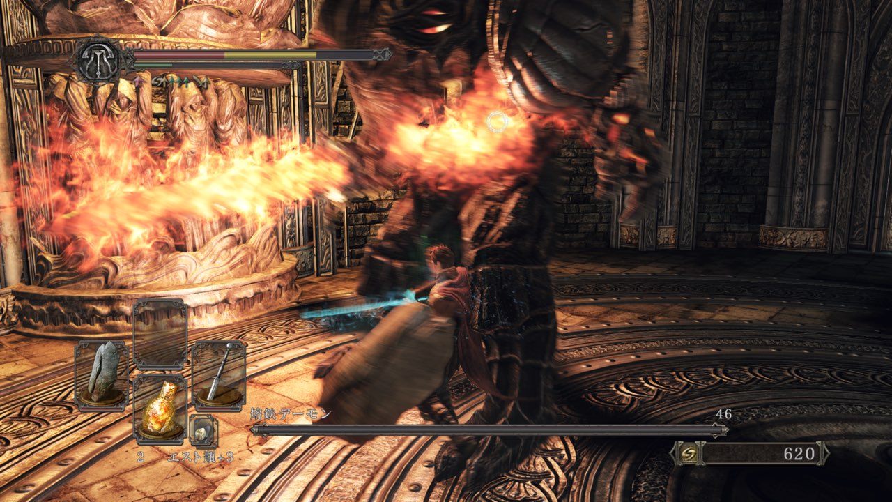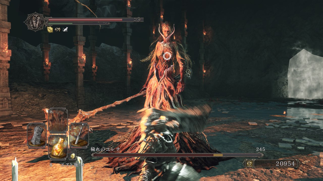 エスト瓶使用後の硬直がひどく、ローリングの動作が遅くて避けたはずの攻撃もしっかりと被弾します。